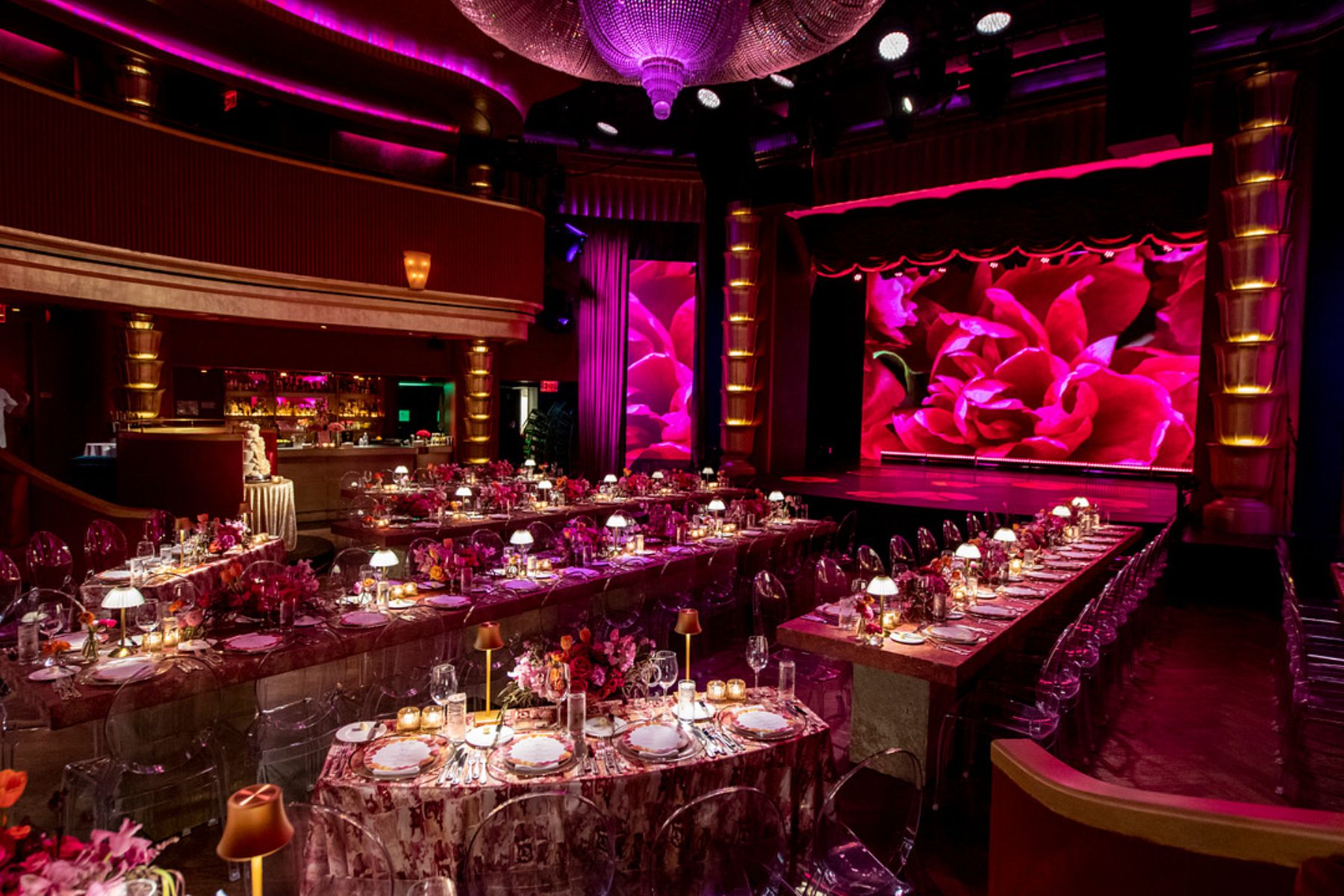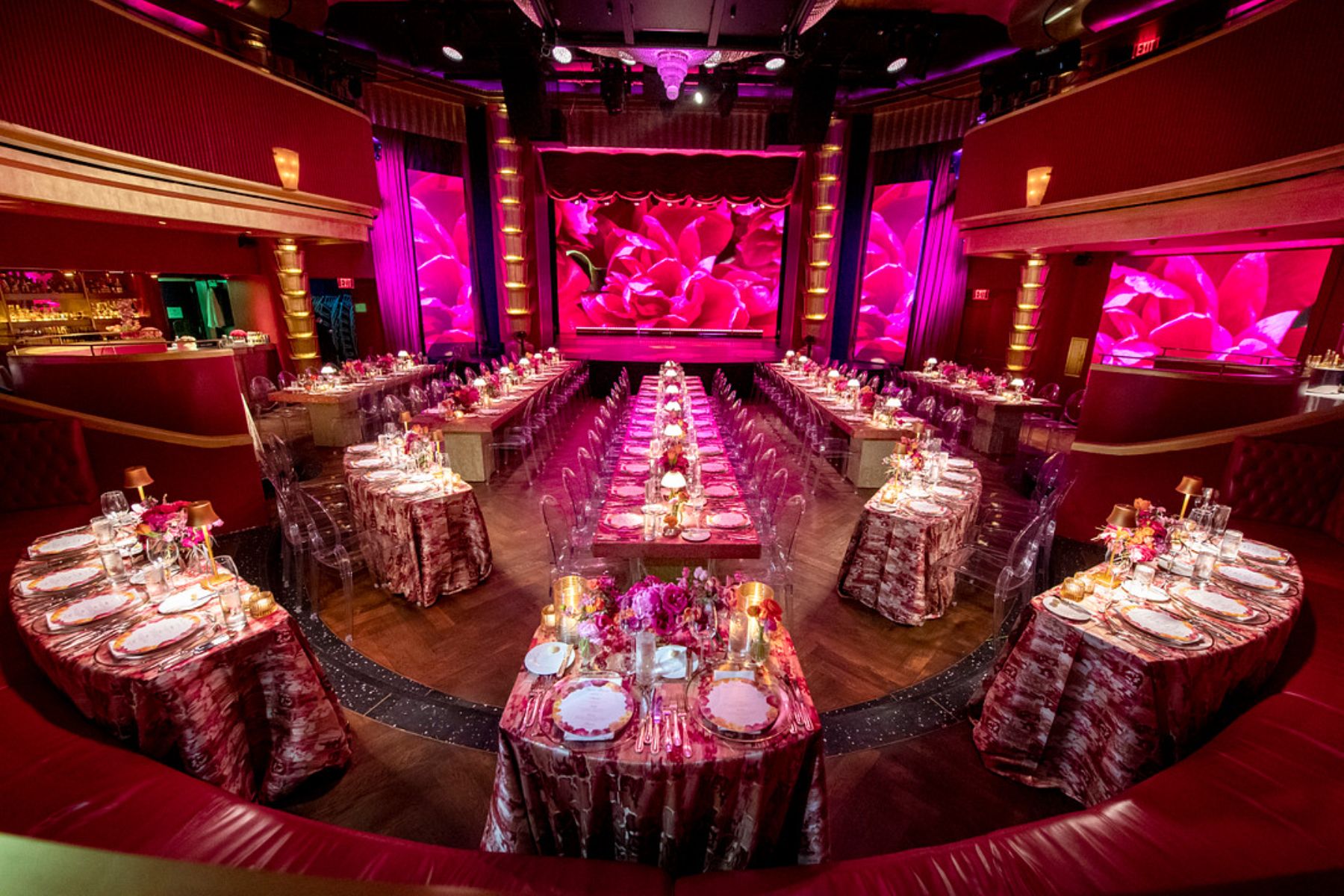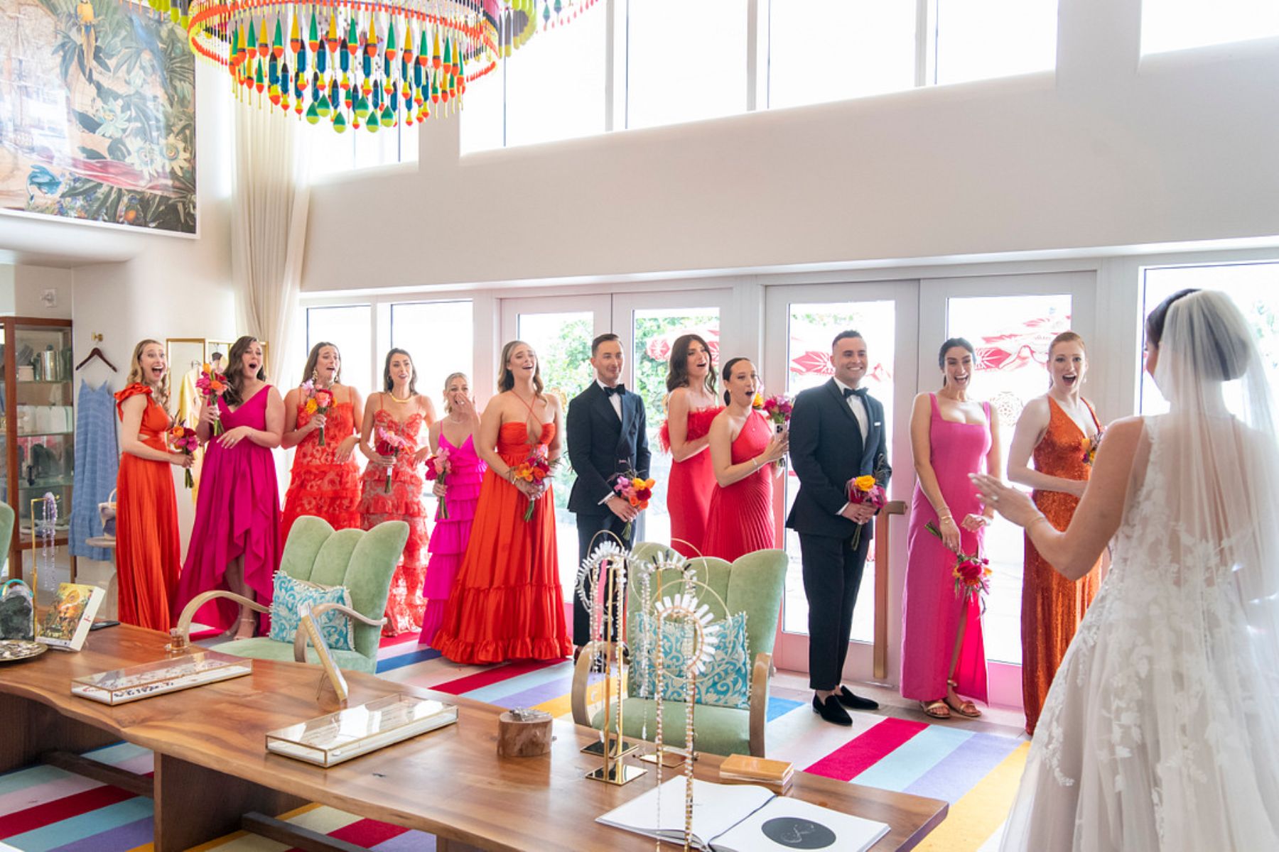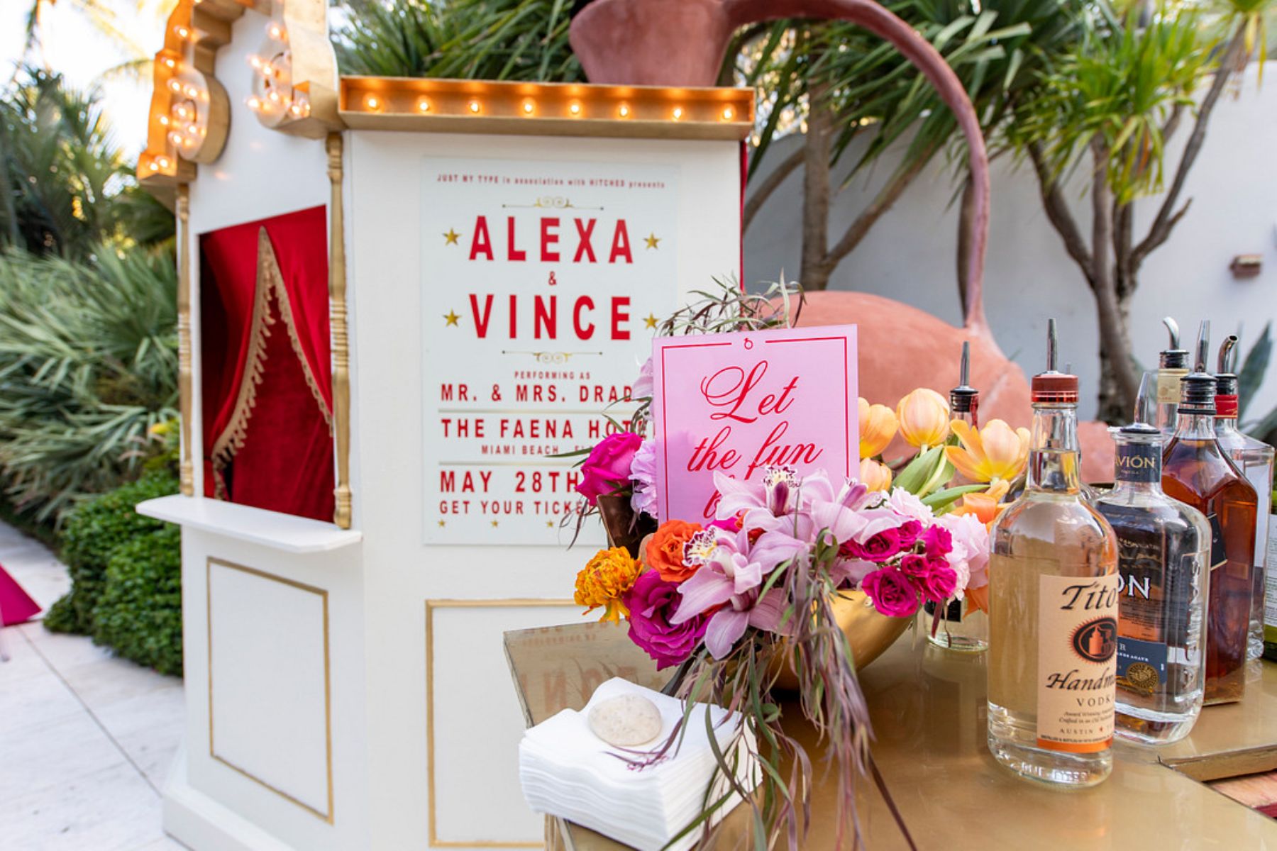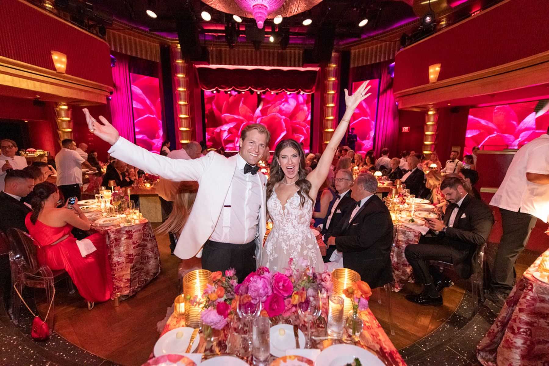 The mood was set with a joyful and bold color palette that matched the couple’s lively personalities. Everything from the décor to the details radiated happiness. Instead of traditional place cards, guests received tickets to the show, setting the tone for the night ahead.