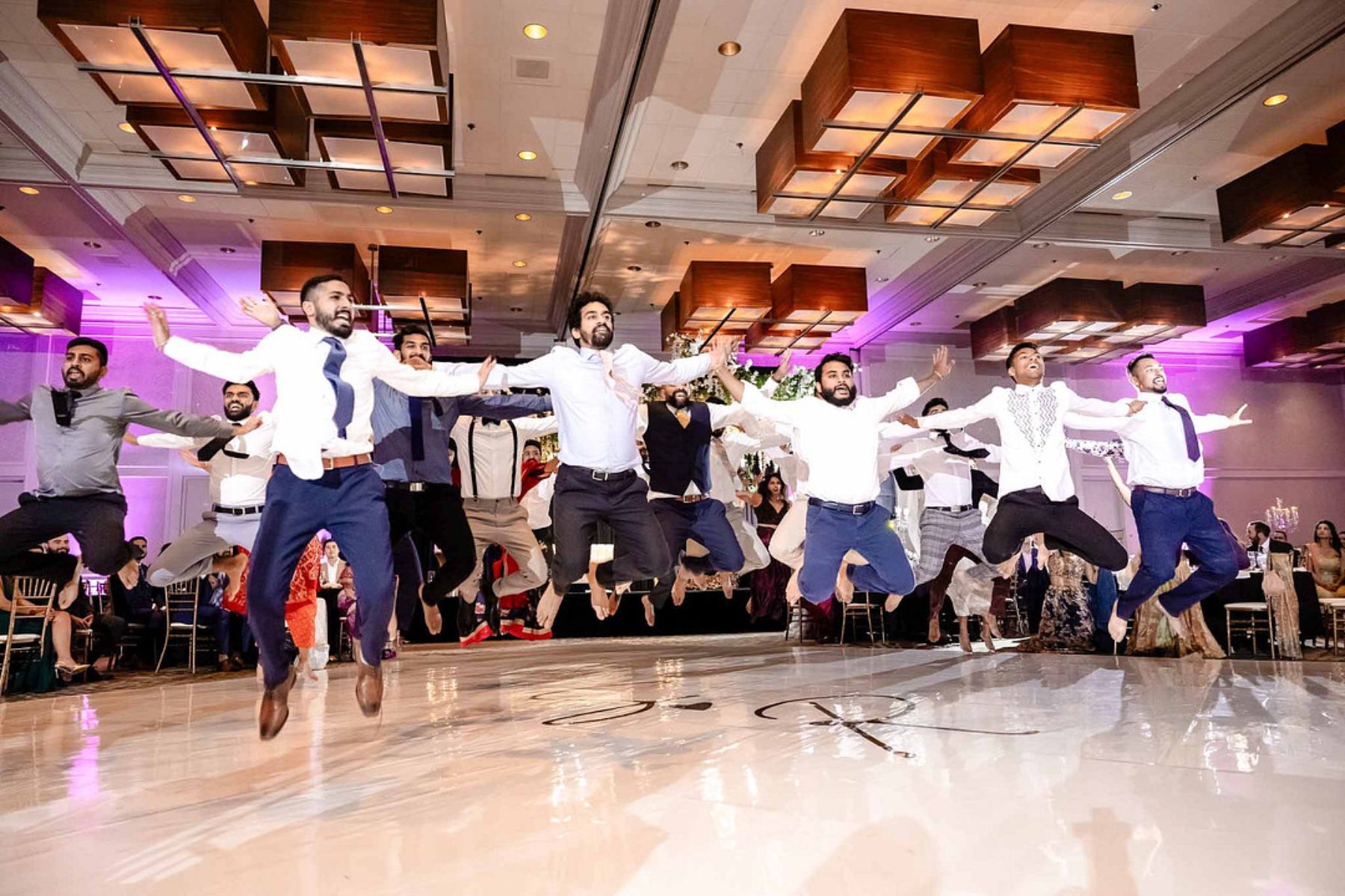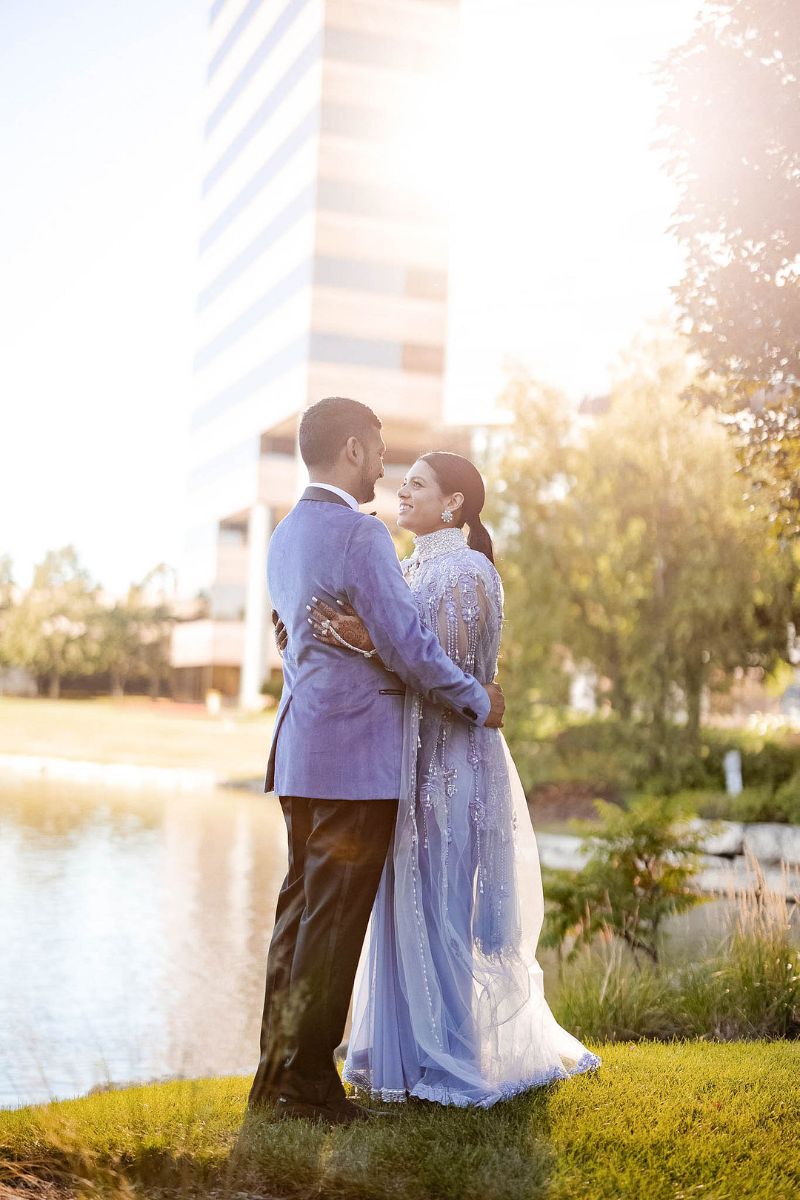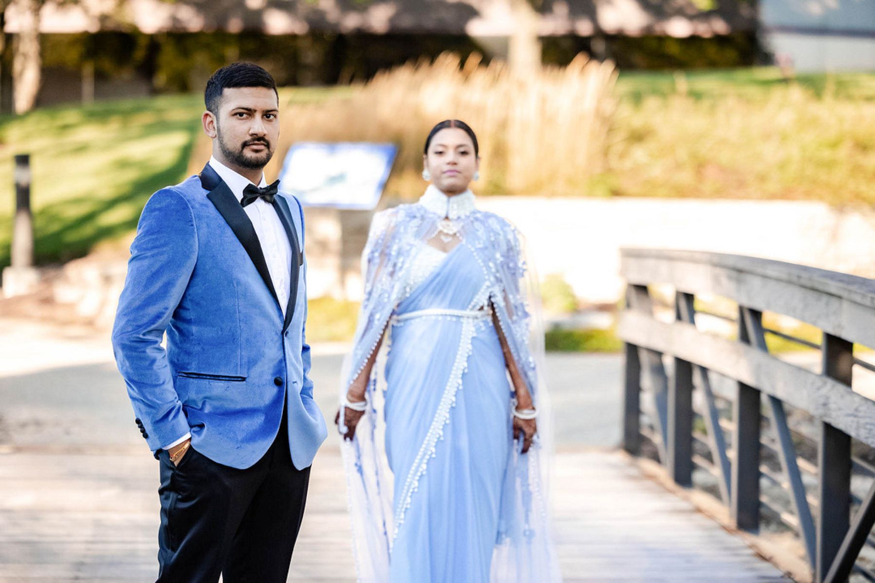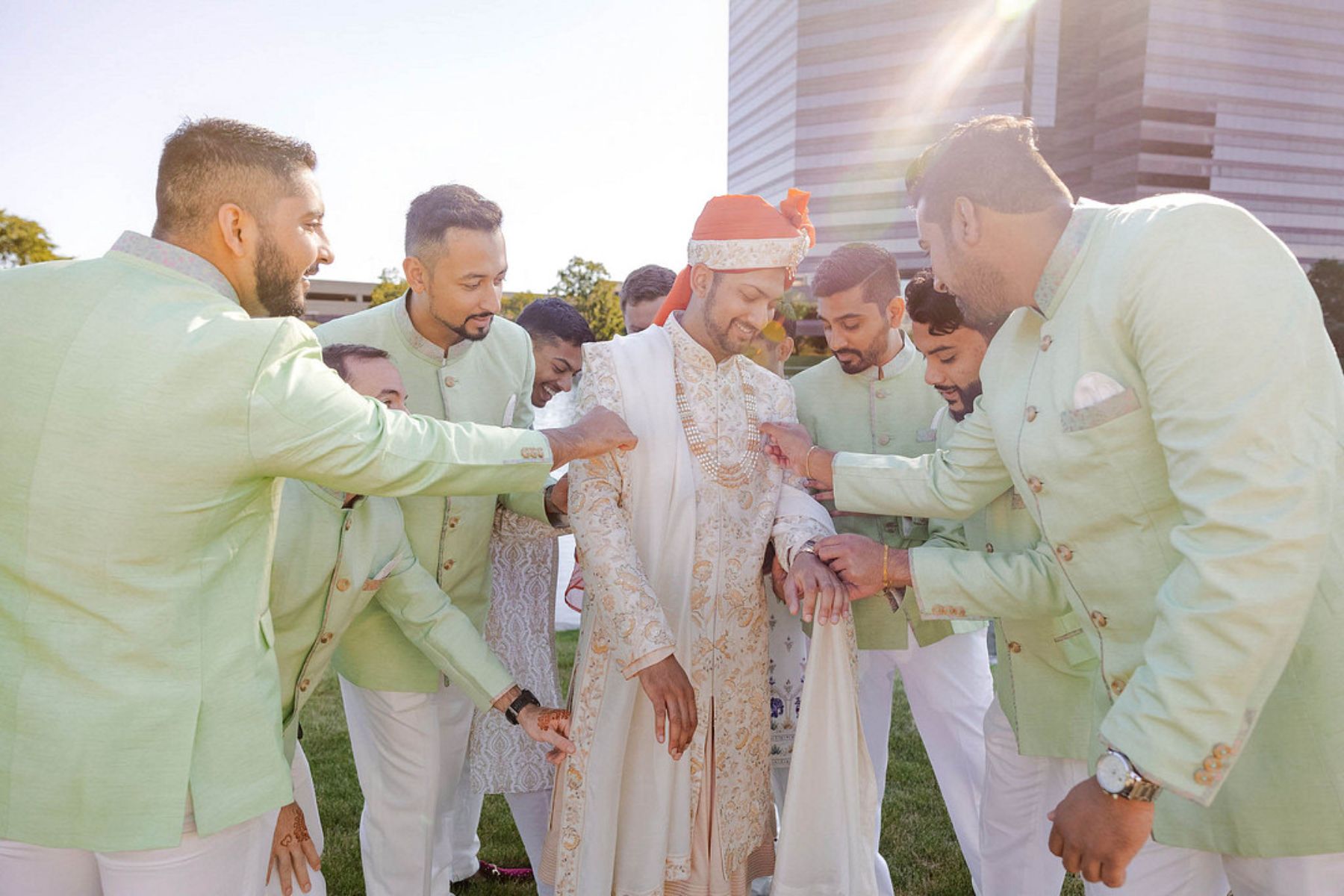 Simron and Rohan poured their hearts into creating an unforgettable wedding. Simron, a talented dancer, and Rohan, a dedicated doctor, planned a spectacular two-day event featuring over 20 choreographed dance performances. Moving from hall to hall at The Westin Chicago Northwest, we set up lighting for each scene, knowing that a wedding of this scale demands professional precision. The venue’s stunning surroundings provided the perfect backdrop for couple and bridal party portraits without having to leave the grounds—a blessing given the couple’s tightly packed schedule.
