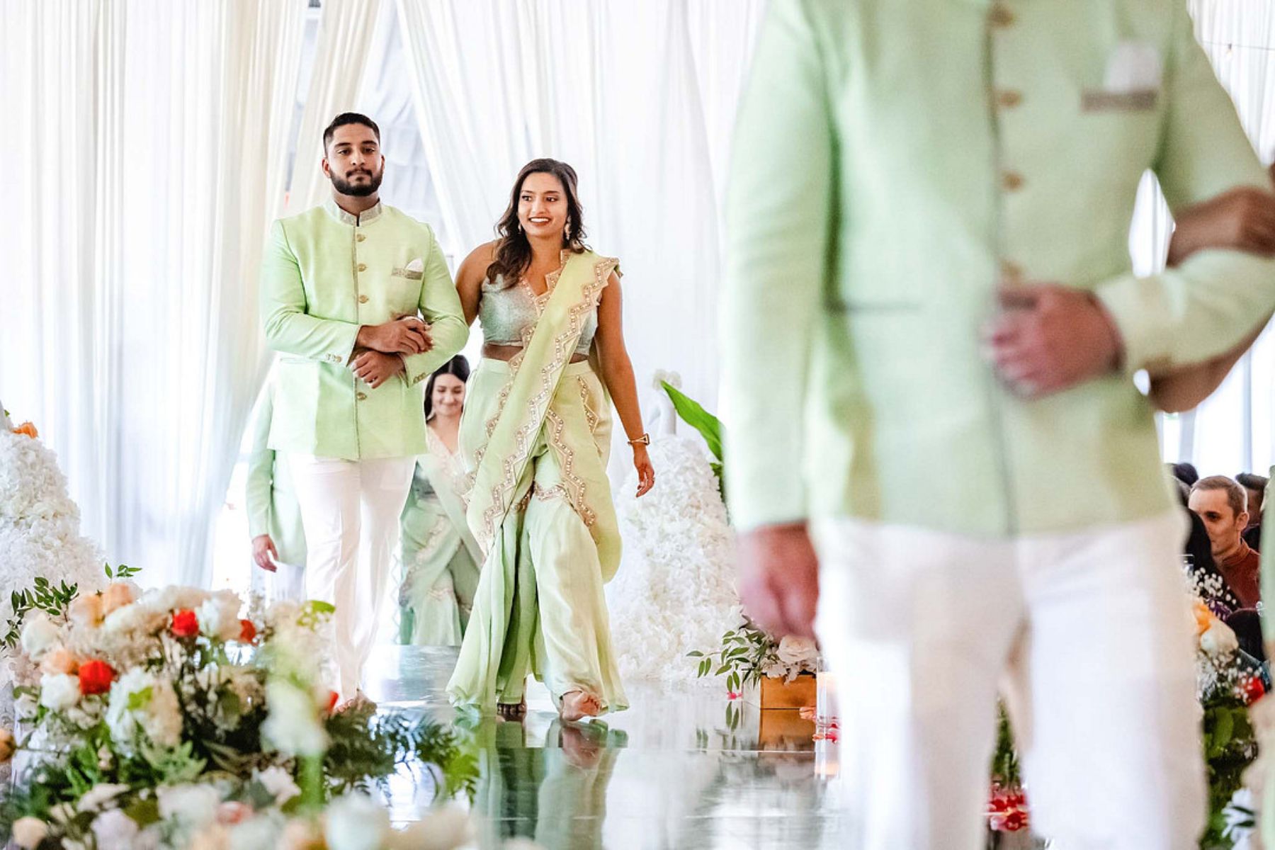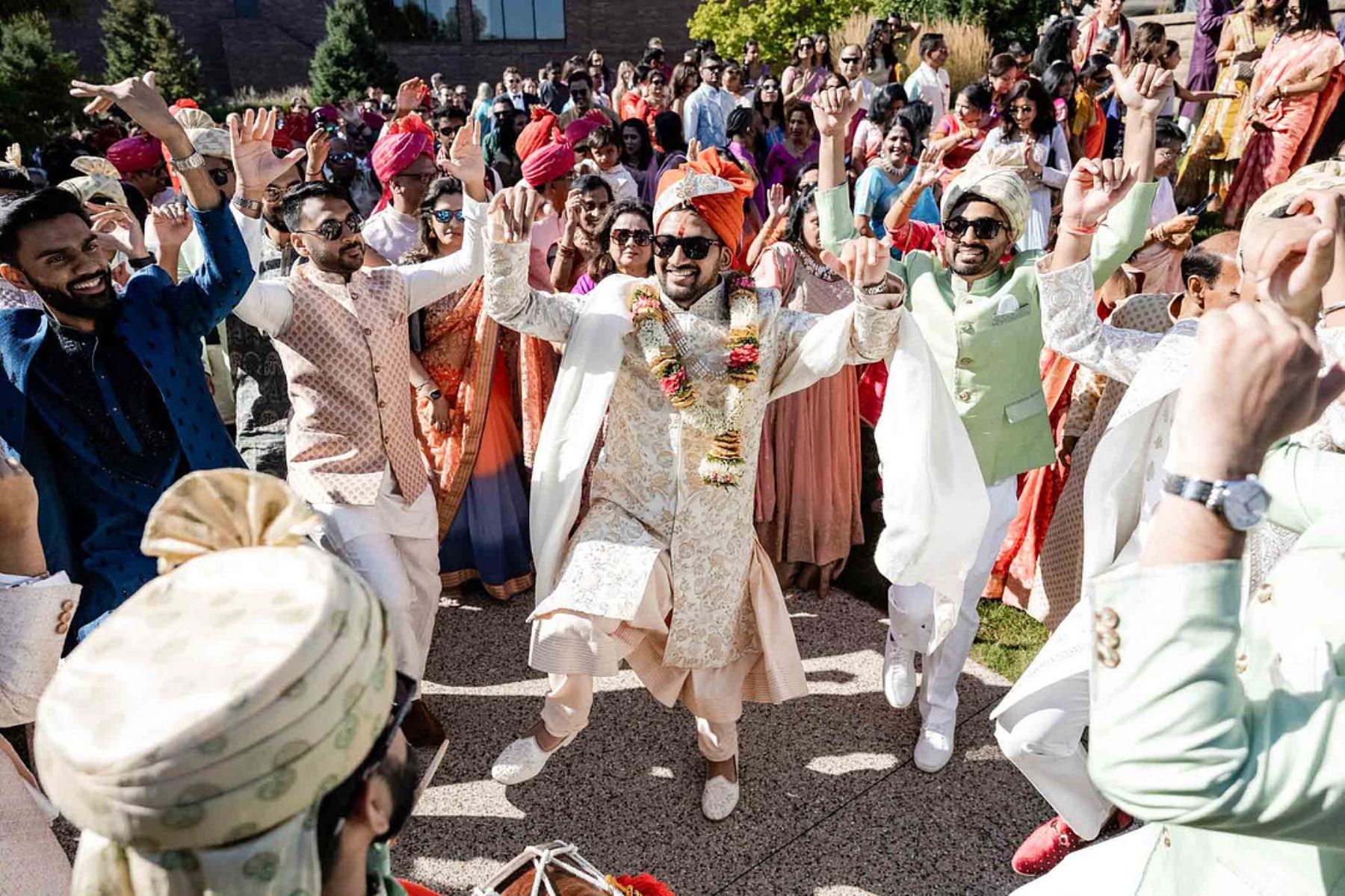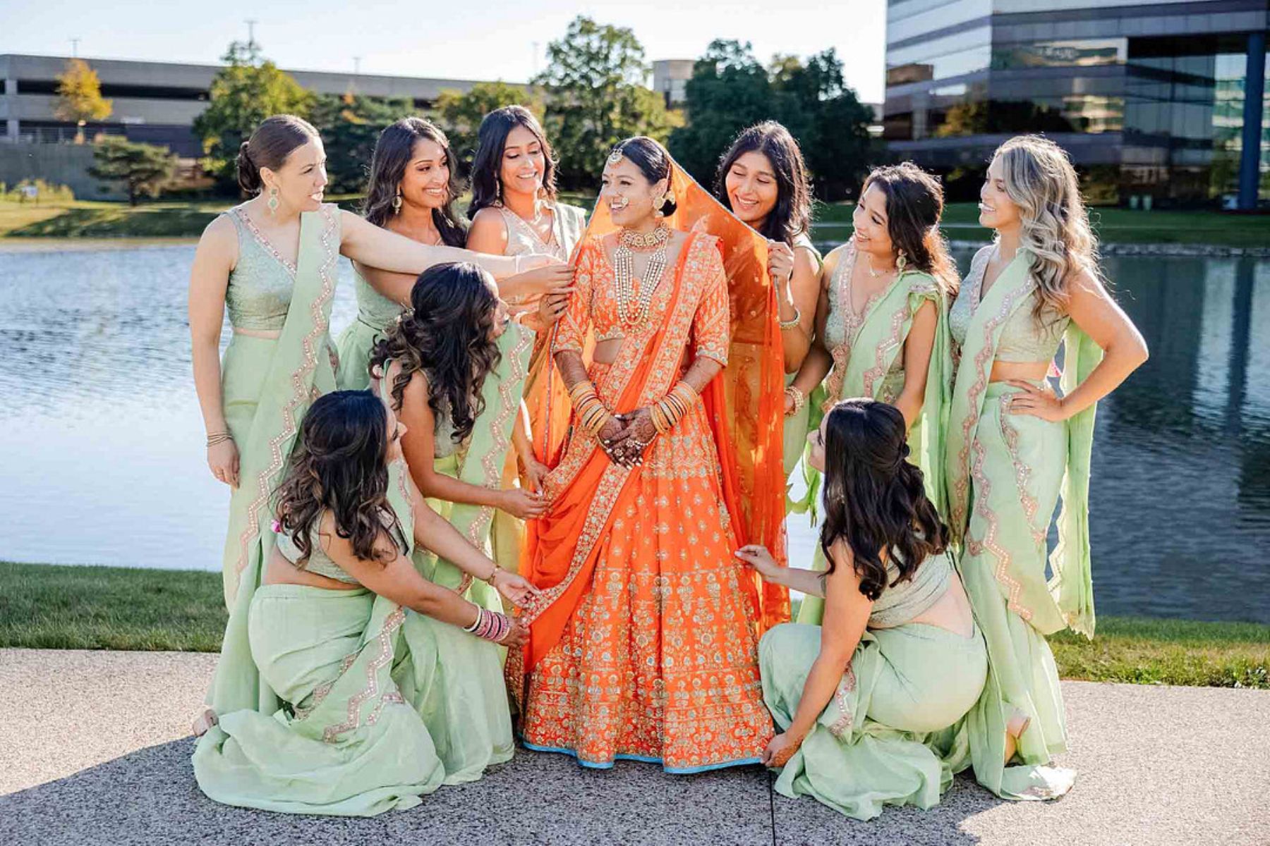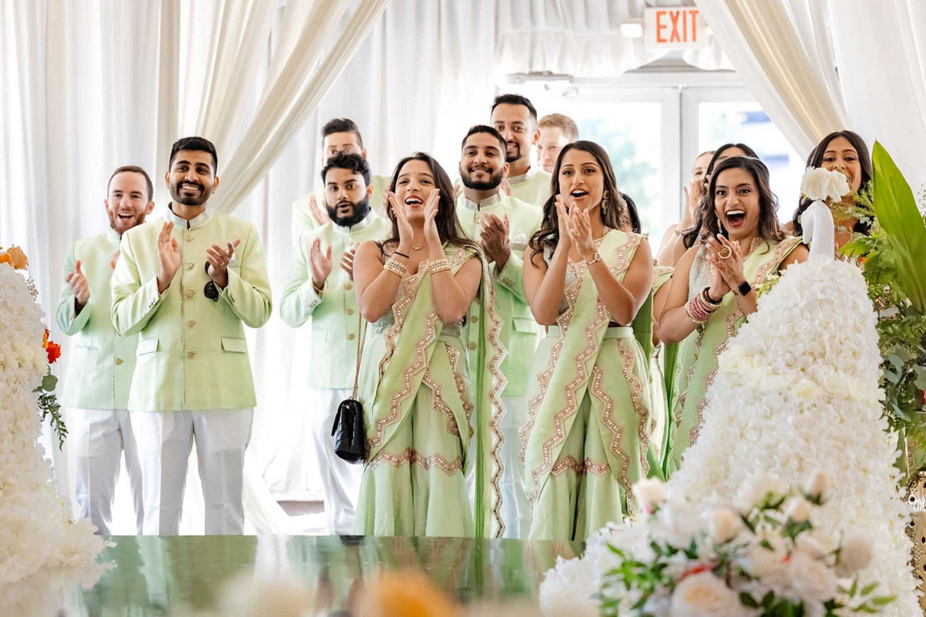 Simron and Rohan poured their hearts into creating an unforgettable wedding. Simron, a talented dancer, and Rohan, a dedicated doctor, planned a spectacular two-day event featuring over 20 choreographed dance performances. Moving from hall to hall at The Westin Chicago Northwest, we set up lighting for each scene, knowing that a wedding of this scale demands professional precision. The venue’s stunning surroundings provided the perfect backdrop for couple and bridal party portraits without having to leave the grounds—a blessing given the couple’s tightly packed schedule.