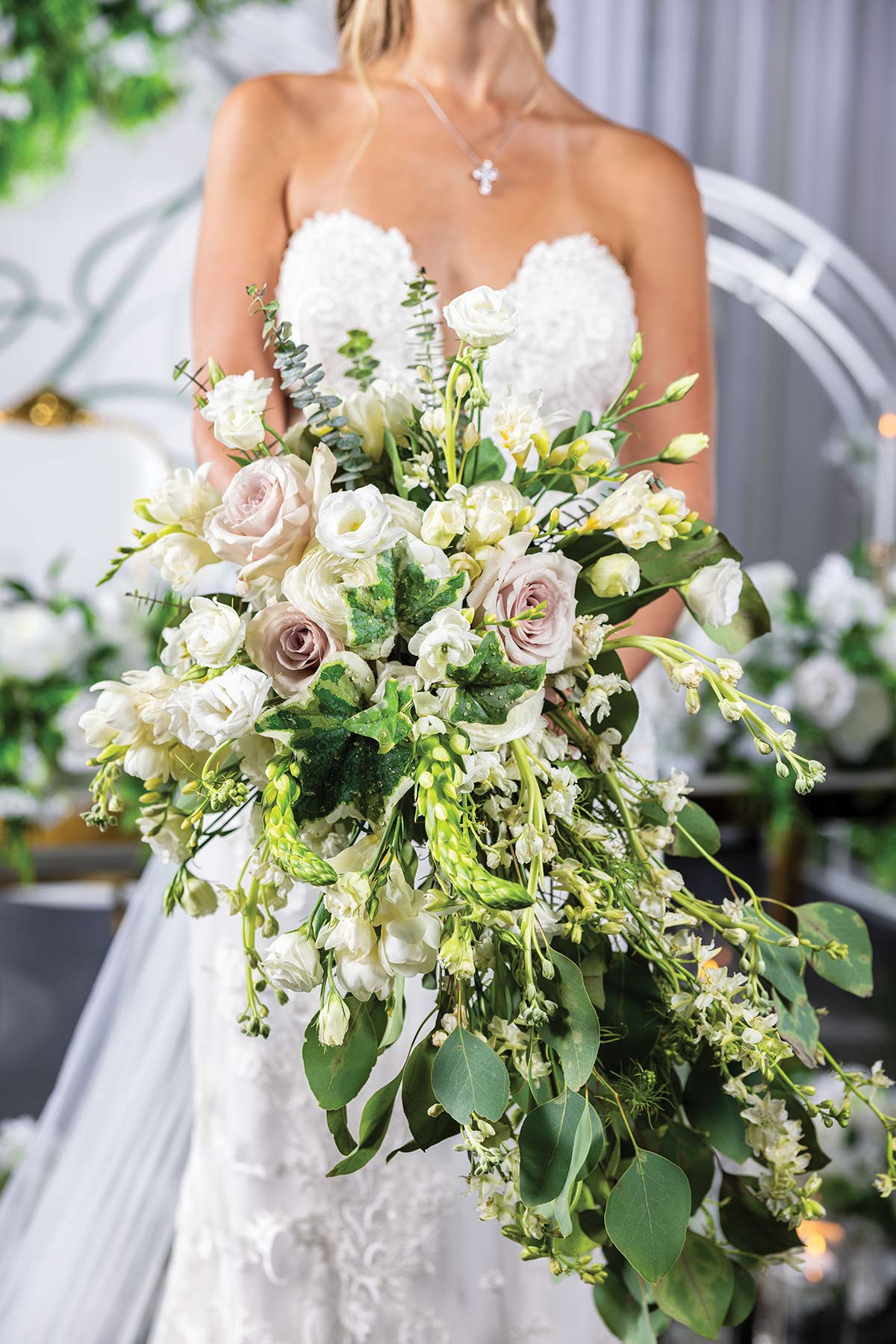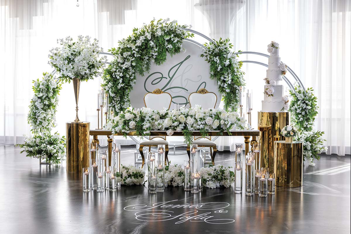 Imagine walking into a venue adorned with cascading greenery and delicate white florals, just like the lush arch framing the couple. The simplicity of white paired with vibrant green foliage brings nature’s beauty indoors, creating a fresh and romantic ambiance. Tables set with gold accents, soft candlelight, and ivory blooms elevate the sophistication while maintaining a natural charm.