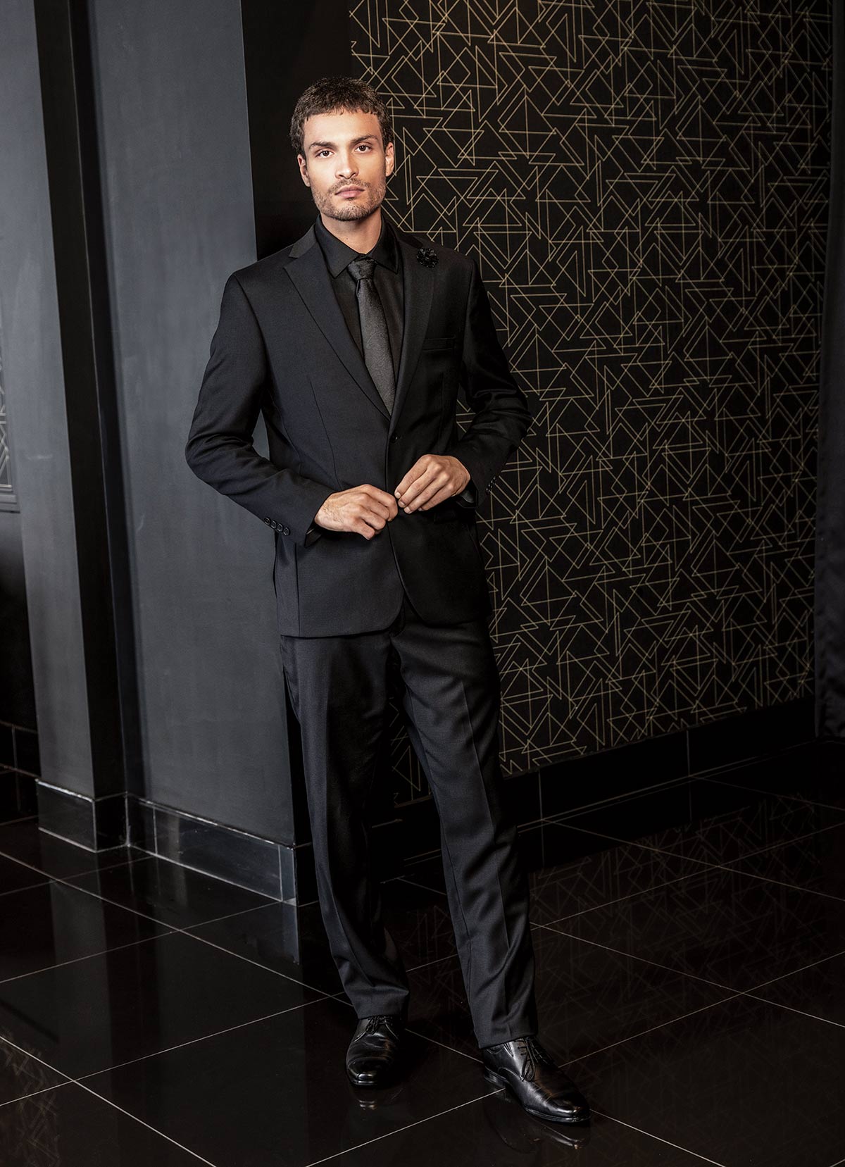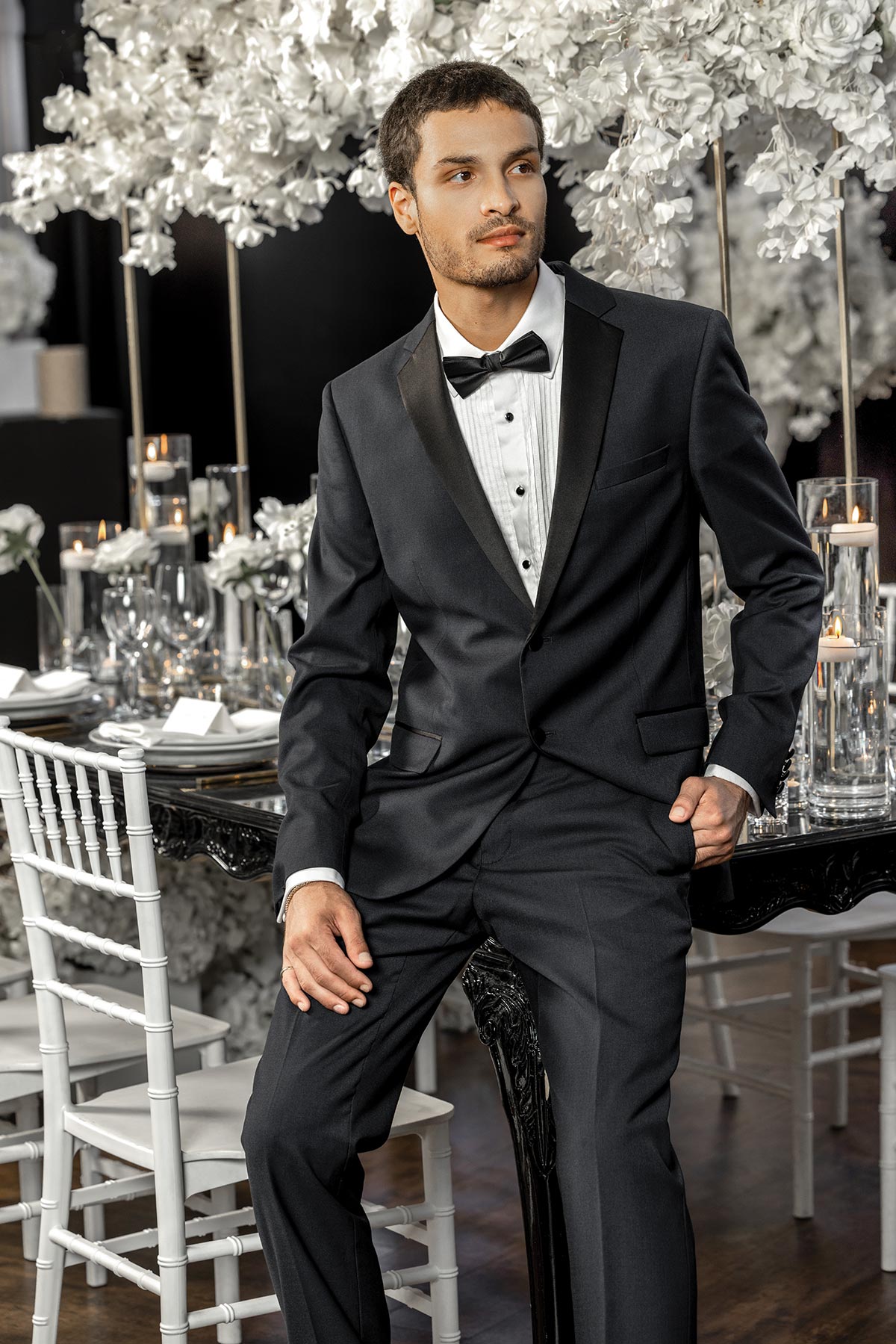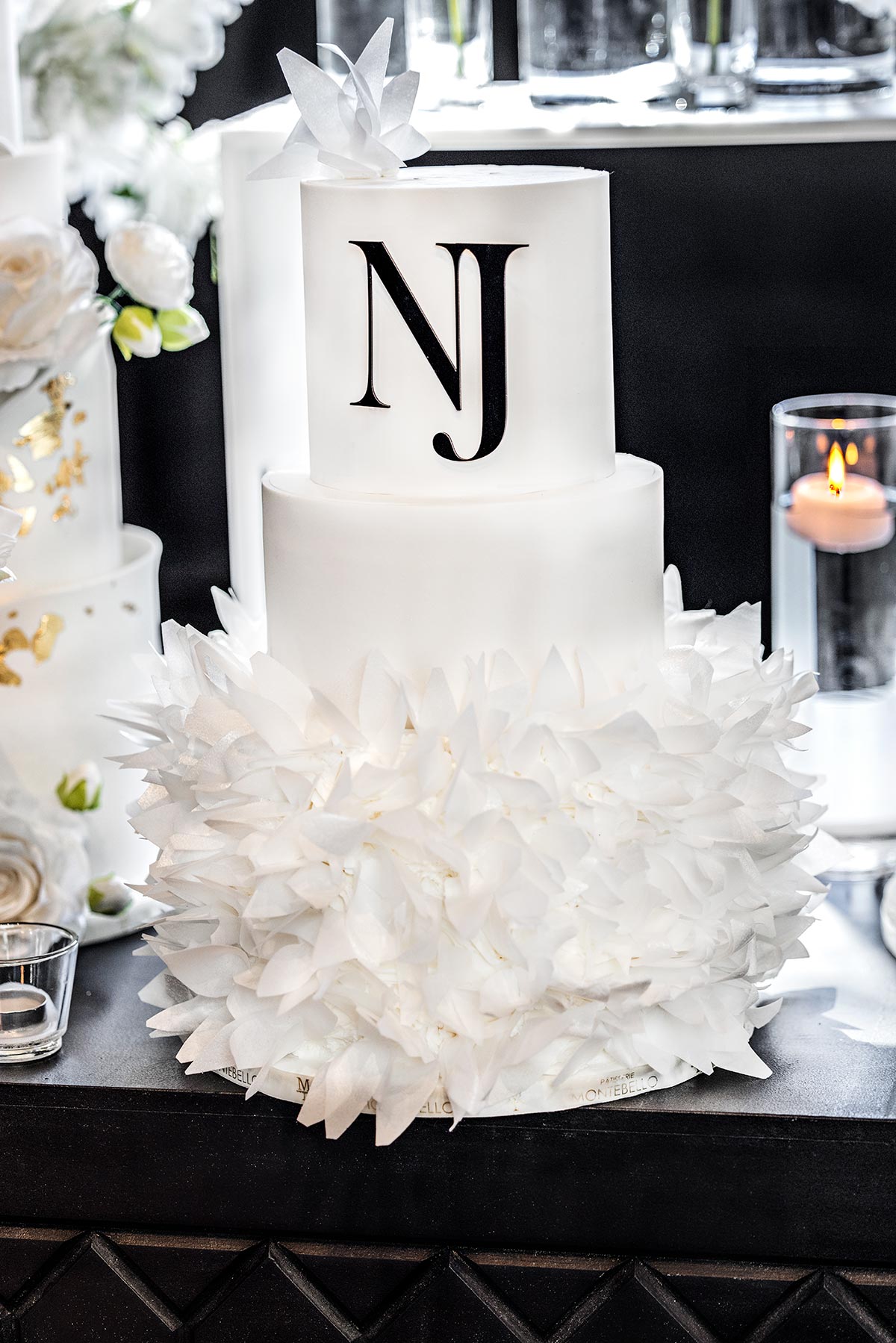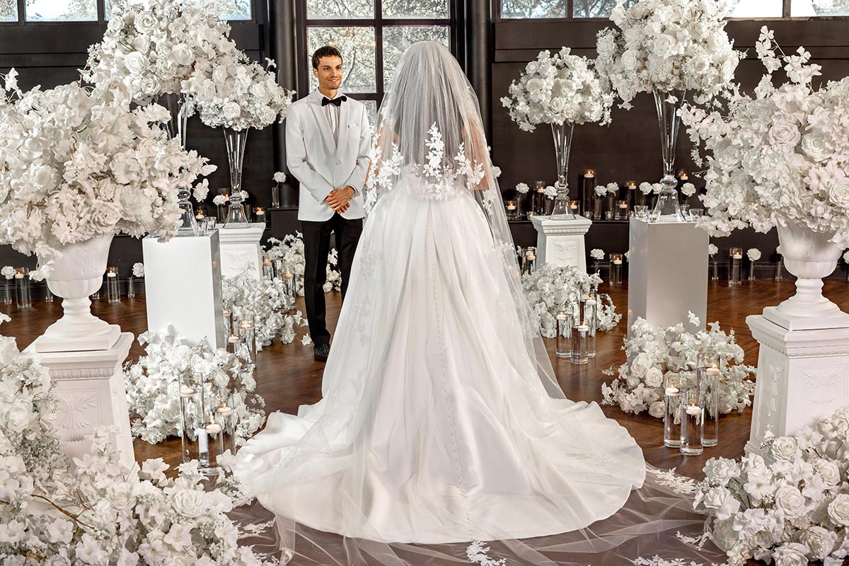 The contrast of crisp white flowers against sleek black accents—like the venue’s dark walls and candlelit ambiance—elevates the aesthetic, making every detail feel intentional and chic. The monochromatic palette allows the beauty of the couple’s attire to shine, with the groom in a white tuxedo and the bride in a classic, structured gown.