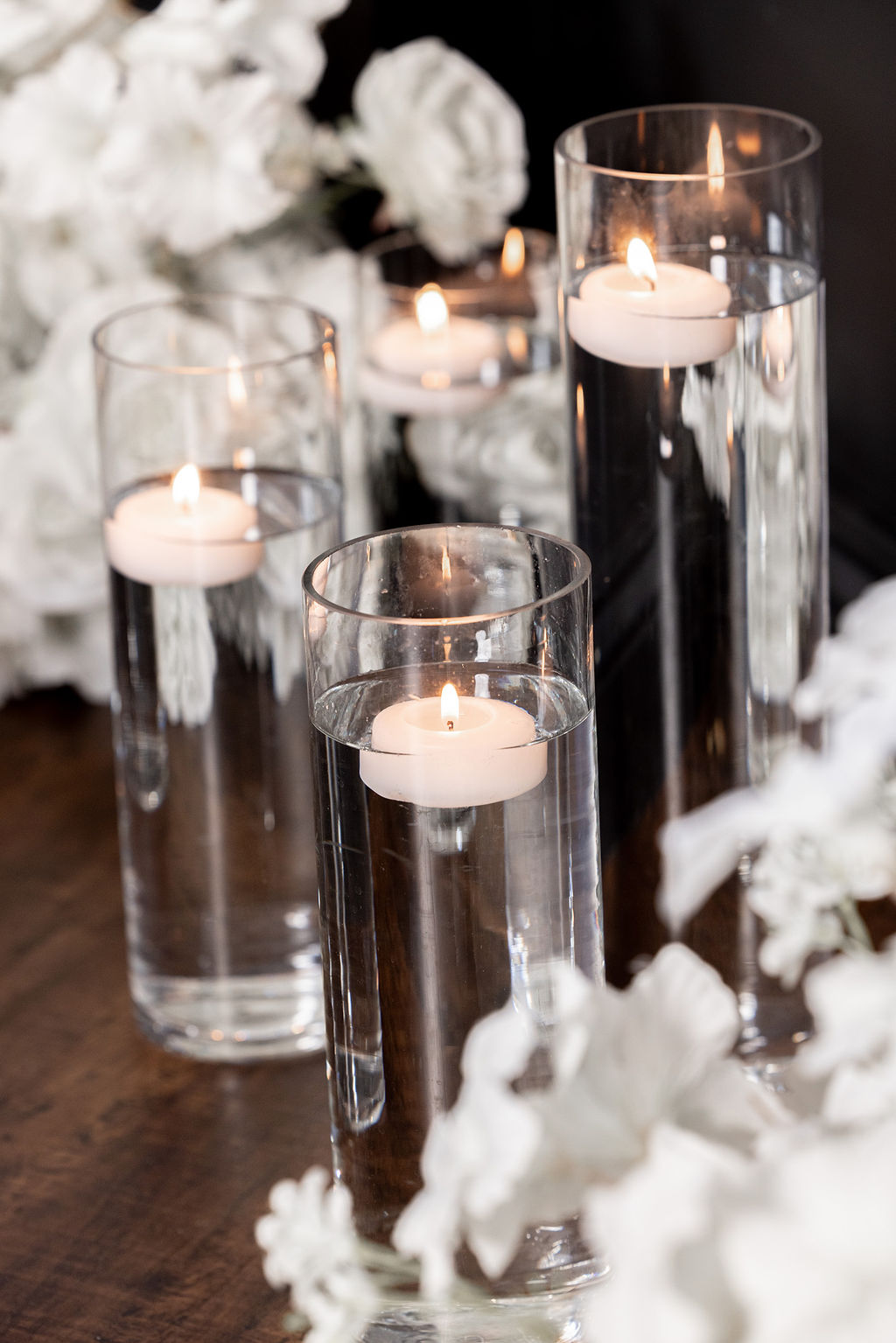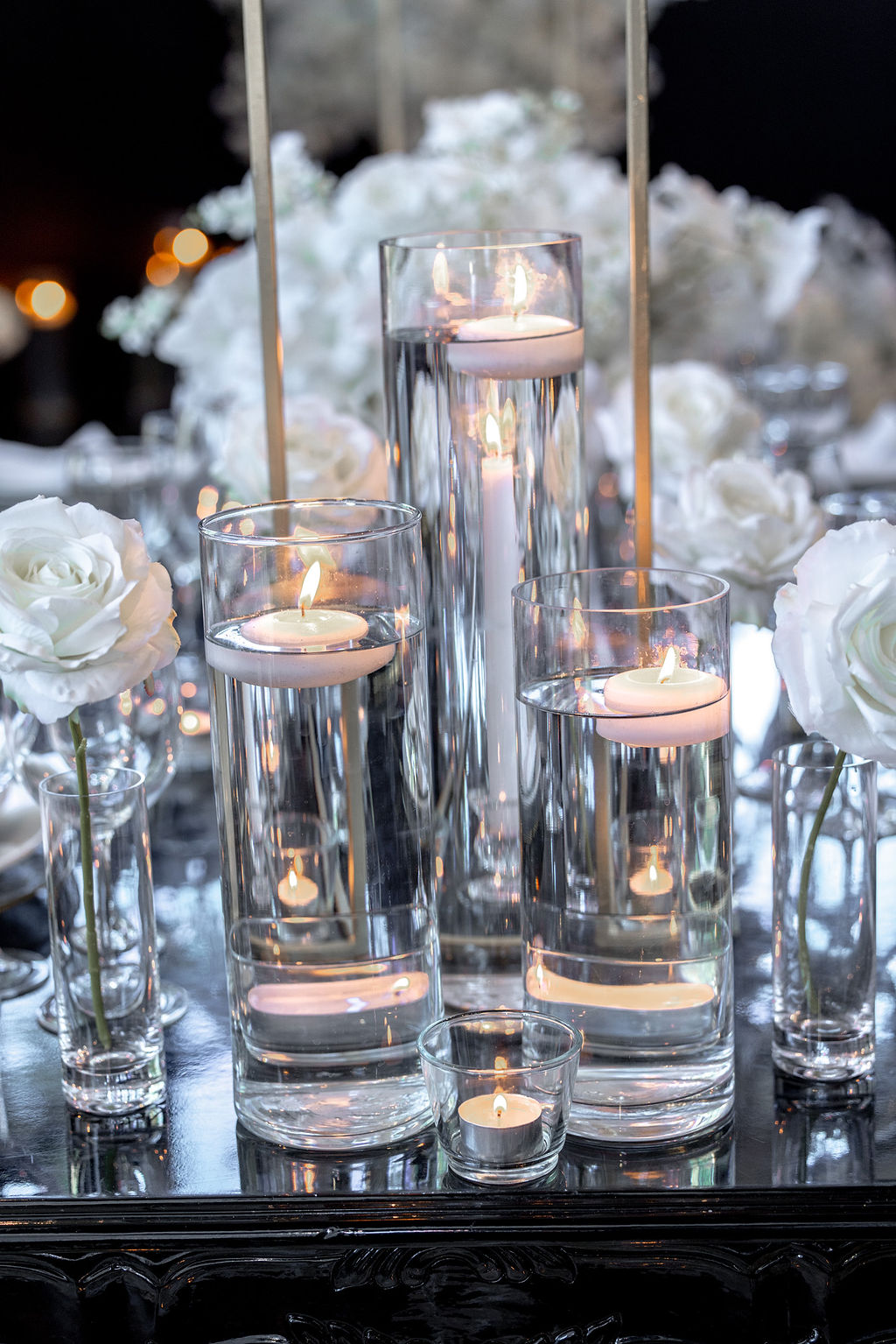 Soft candlelight reflecting off glass vases and mirrored surfaces enhances the ethereal quality of the space, giving it a dreamy, almost heavenly atmosphere. This theme is perfect for couples who want to make a bold yet timeless statement on their special day—proving that simplicity and elegance go hand in hand.