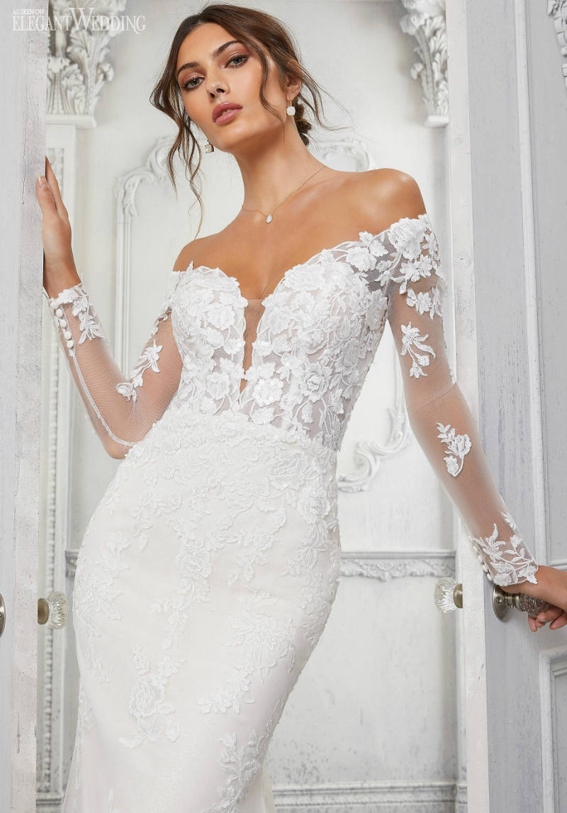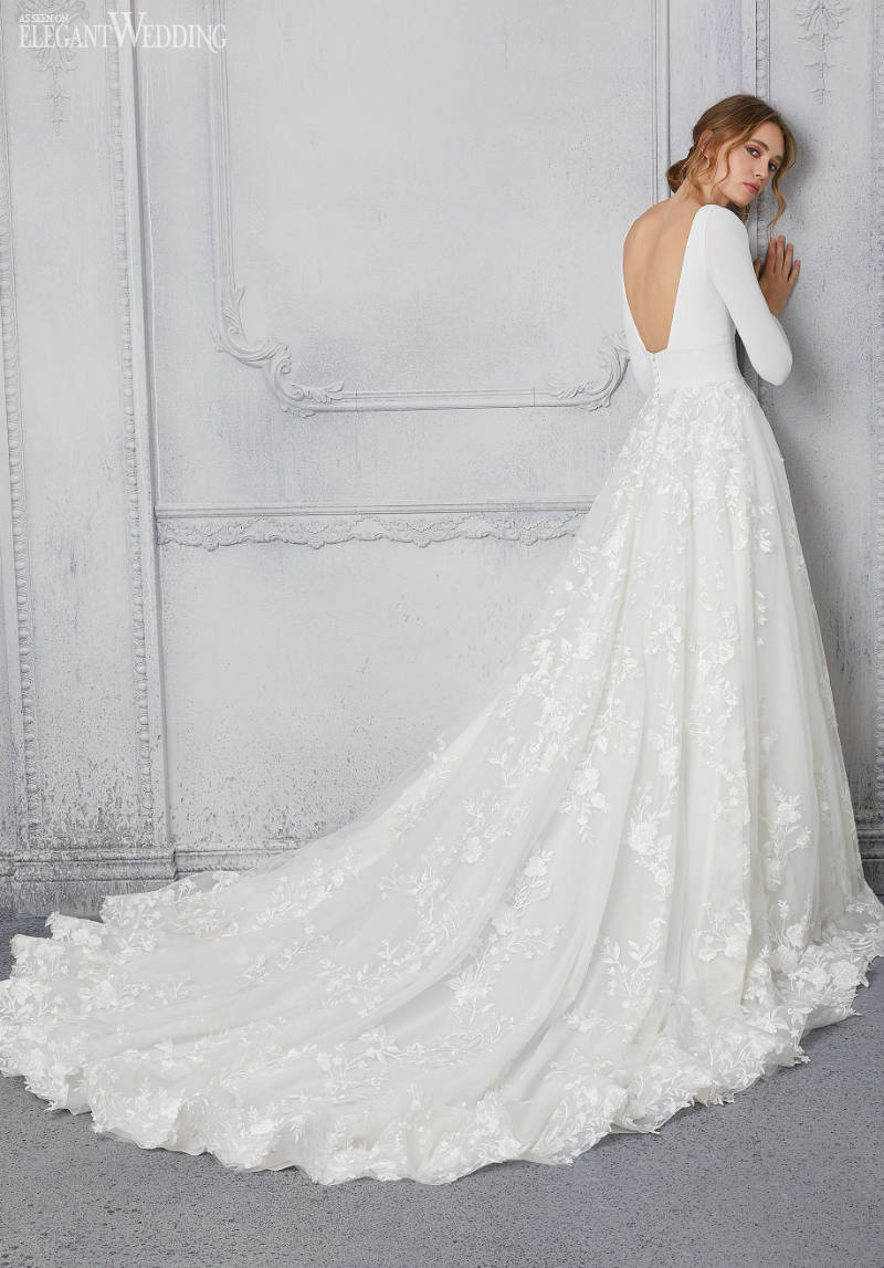The Blu Collection features structured silhouettes in sultry Larissa satin and luxe crepe. Designer Madeline Gardner creates movement with softly draped English net and tulle, and adds drama with flattering necklines and breathtaking back details. Light touches of floral lace and sparkling crystal bring romance to these modern styles. Above all, these gorgeous gowns put the spotlight where it should be: on you.