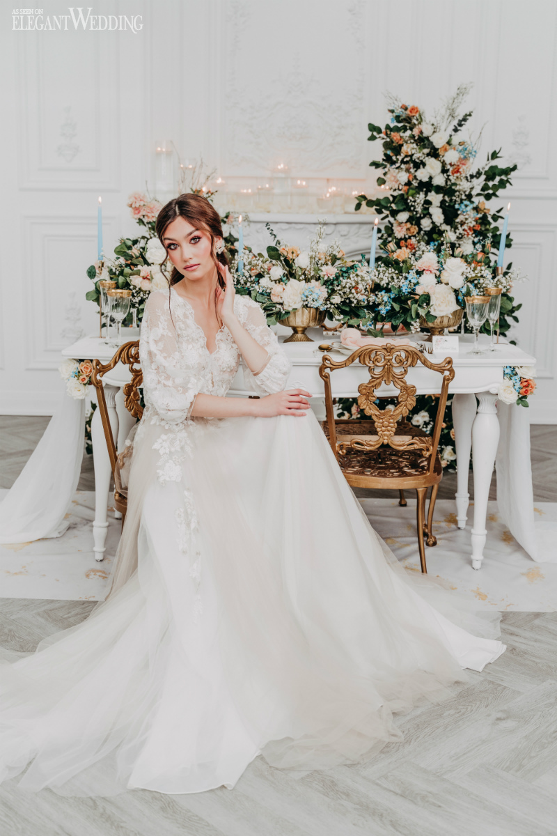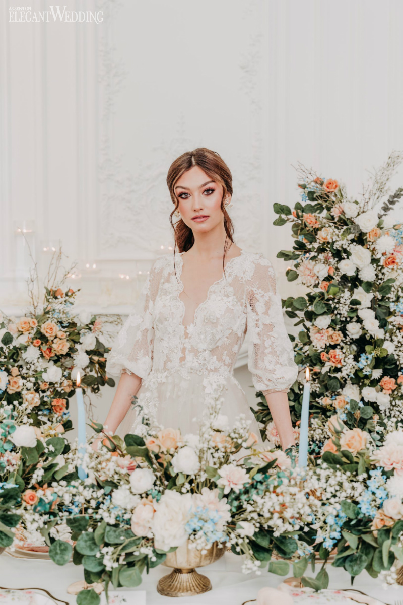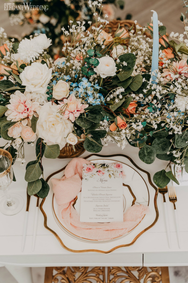 A stylish tablescape features pastel blue tapered candles, gold accents, and a romantic vibe with gauzy fabrics designed to wrap guests with the feeling of old-world charm and elegance.