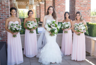 To celebrate a decade of true love with family and friends, Christina and Ryan selected a theme of classic romance for their wedding. Florals took on soft hues of blush, peach and ivory, while decor such as chairs, tableware, chandeliers and a monogrammed dance floor centred on gold. Keeping with the classic theme, the bride and groom showed up in a classic white Rolls Royce. Both being Jamaican, the couple also decided to incorporate cultural elements for guests such as Jamaican rum punch, a reggae father-daughter dance and Jamaican fruit cake favours. Keeping the festivities going was a live harpist and artist at the reception followed by fireworks at night.