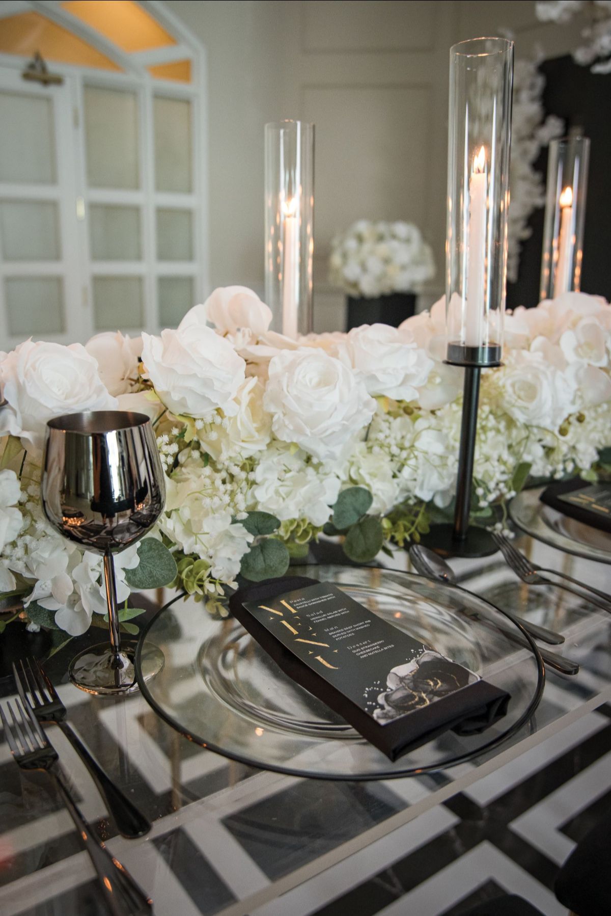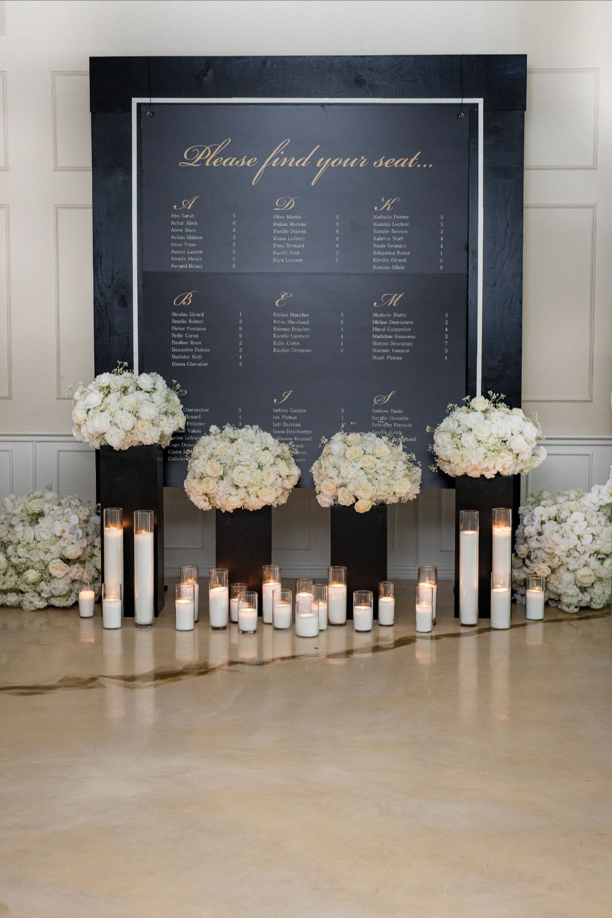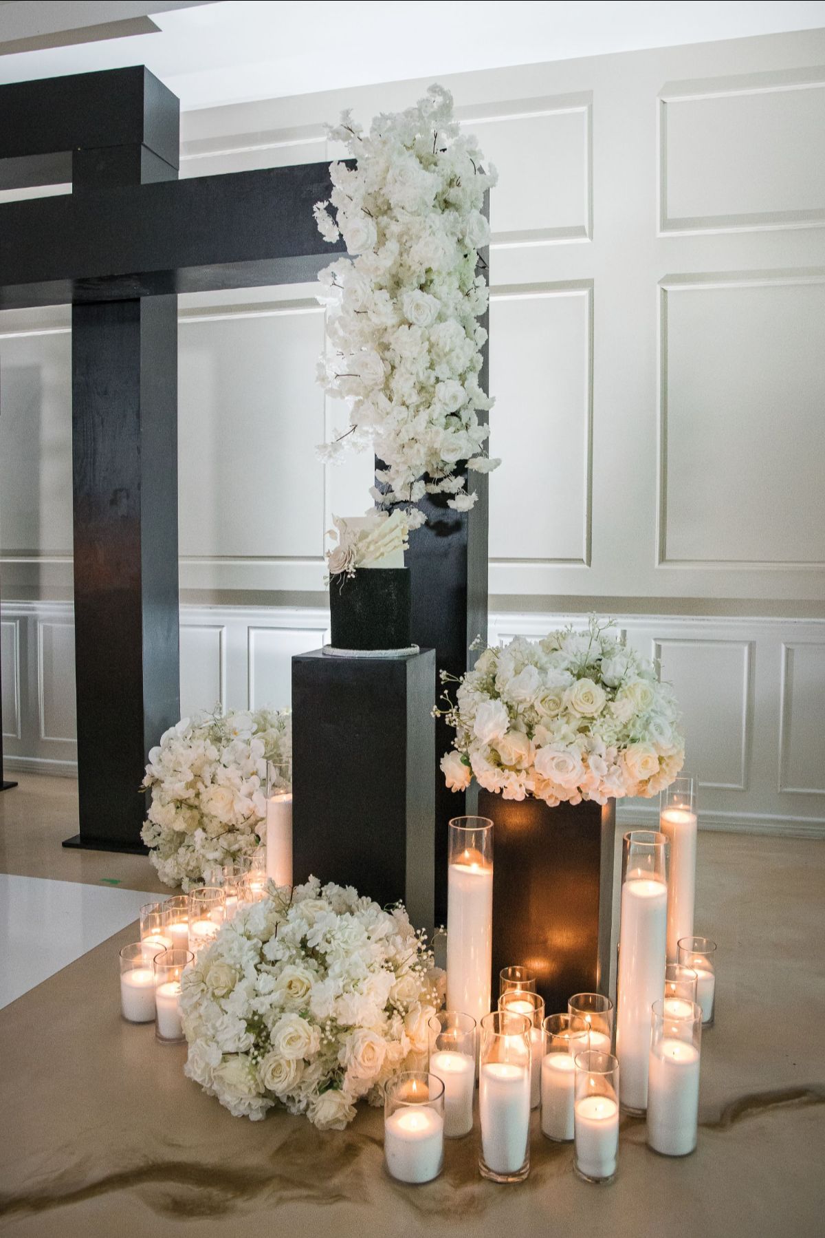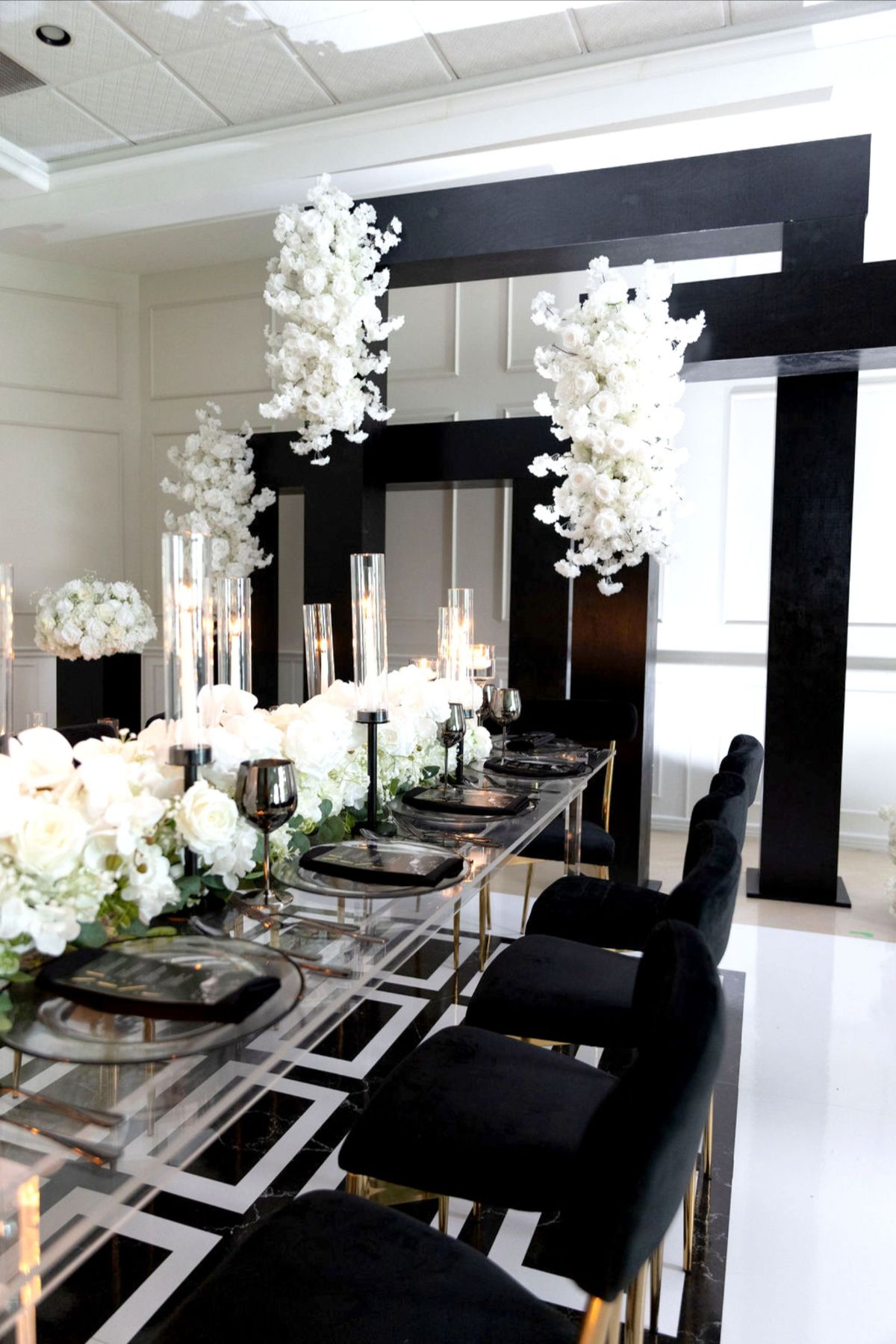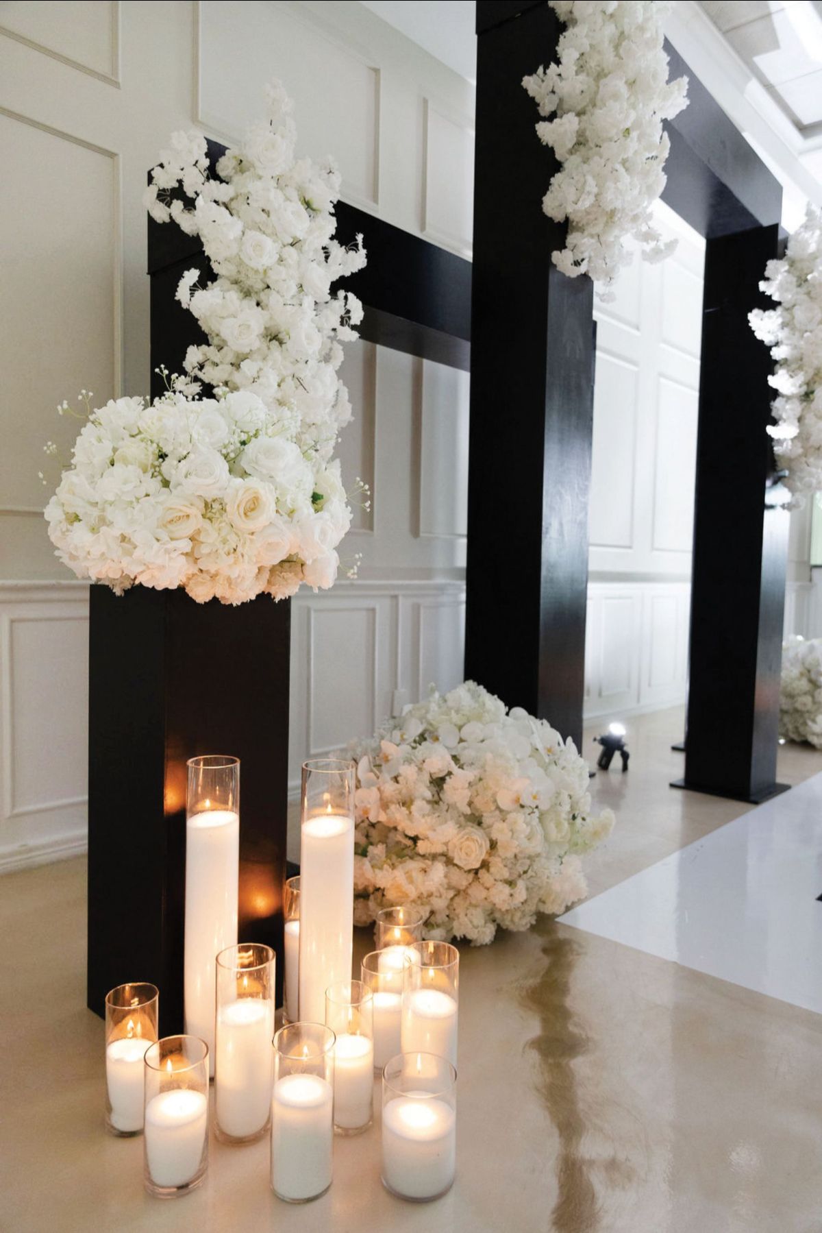 The all-white blooms add romance and balance, ensuring the luxury design never feels too stark. Whether styled overhead, grounded at the base of the frames, or arranged along the table, the florals bring movement and texture to the space.