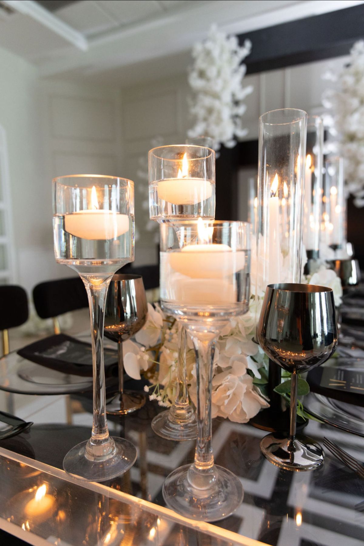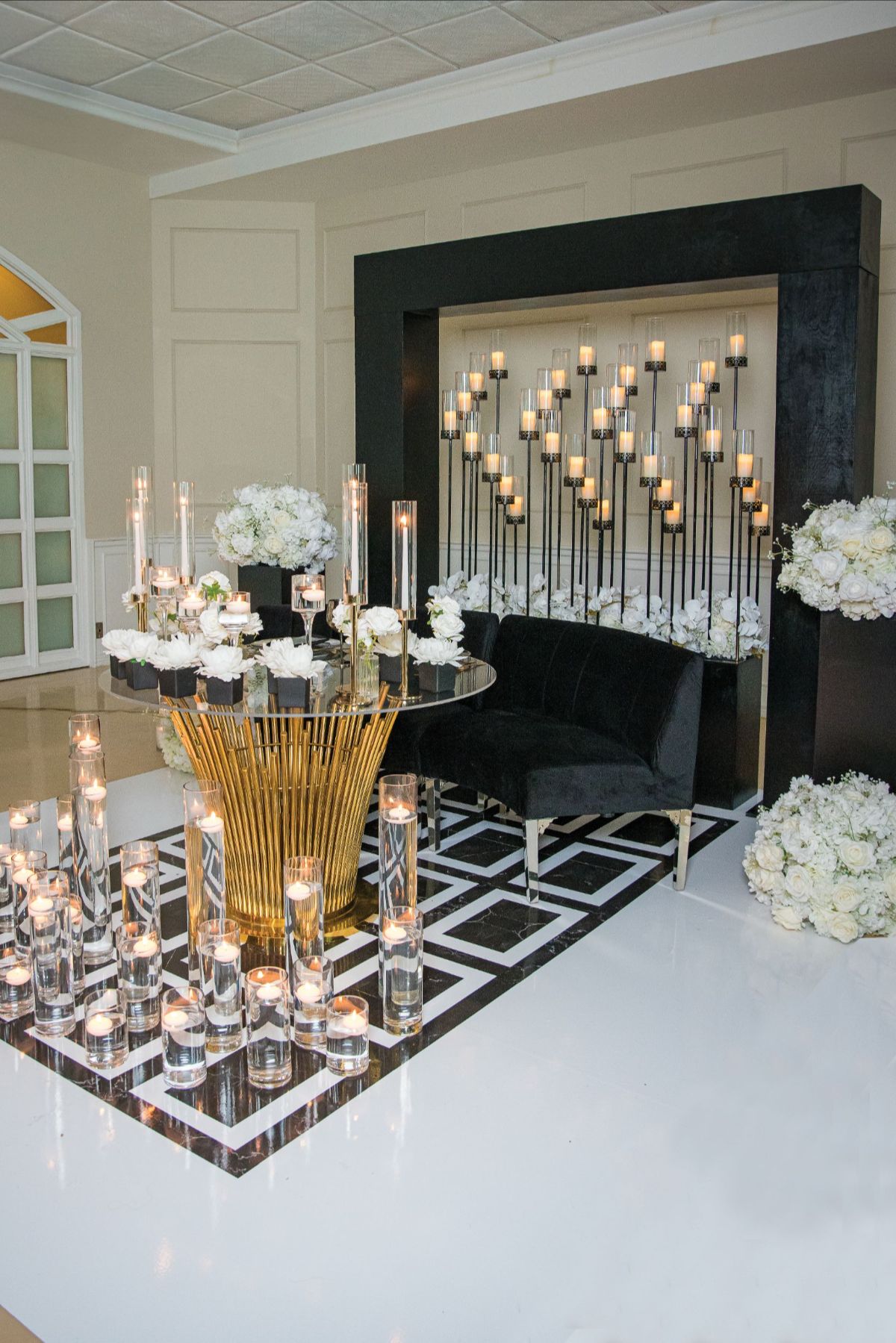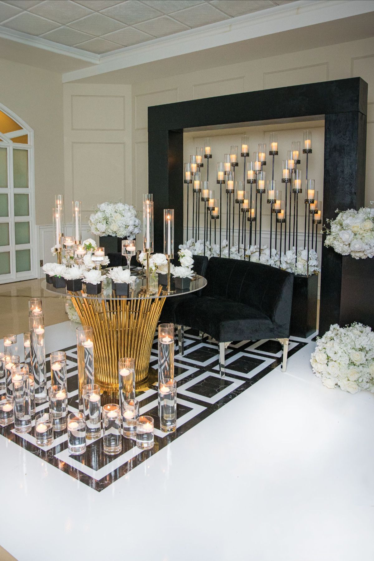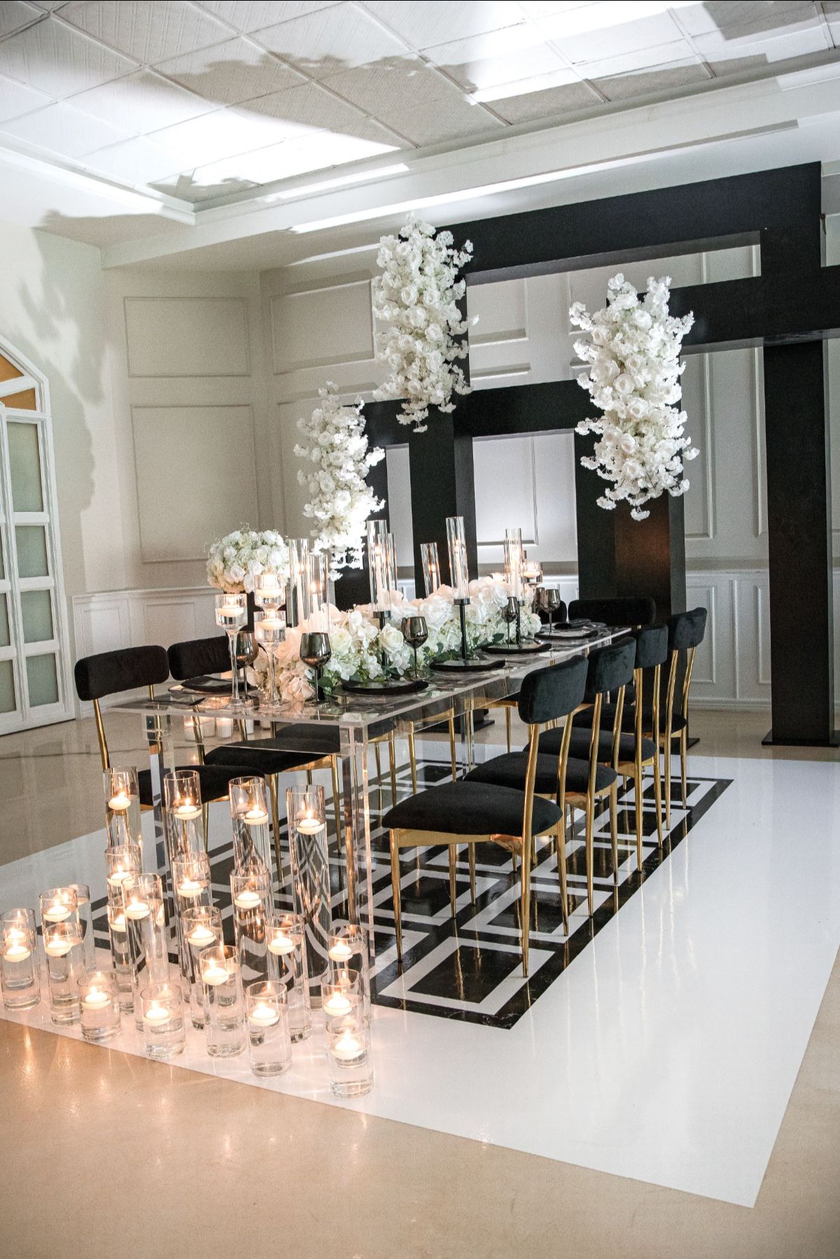 Explore this luxury wedding feature showcasing black, white, and gold decor, statement florals, candlelit details, and a modern elegant wedding aesthetic.