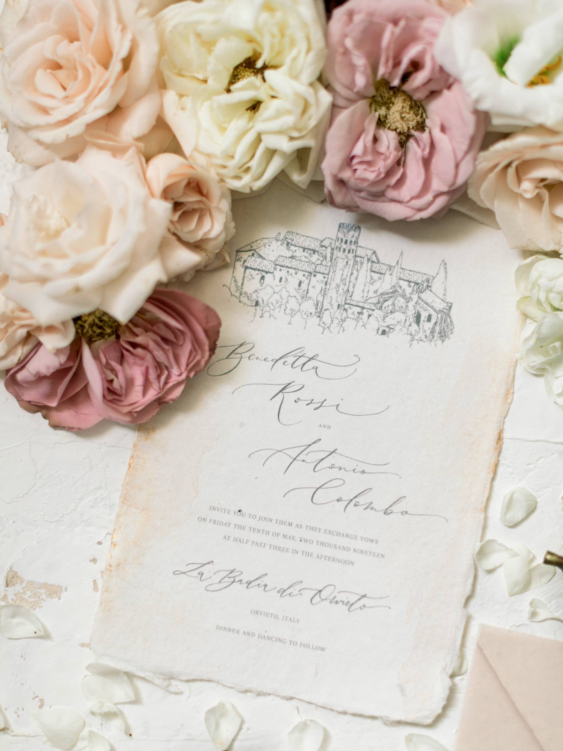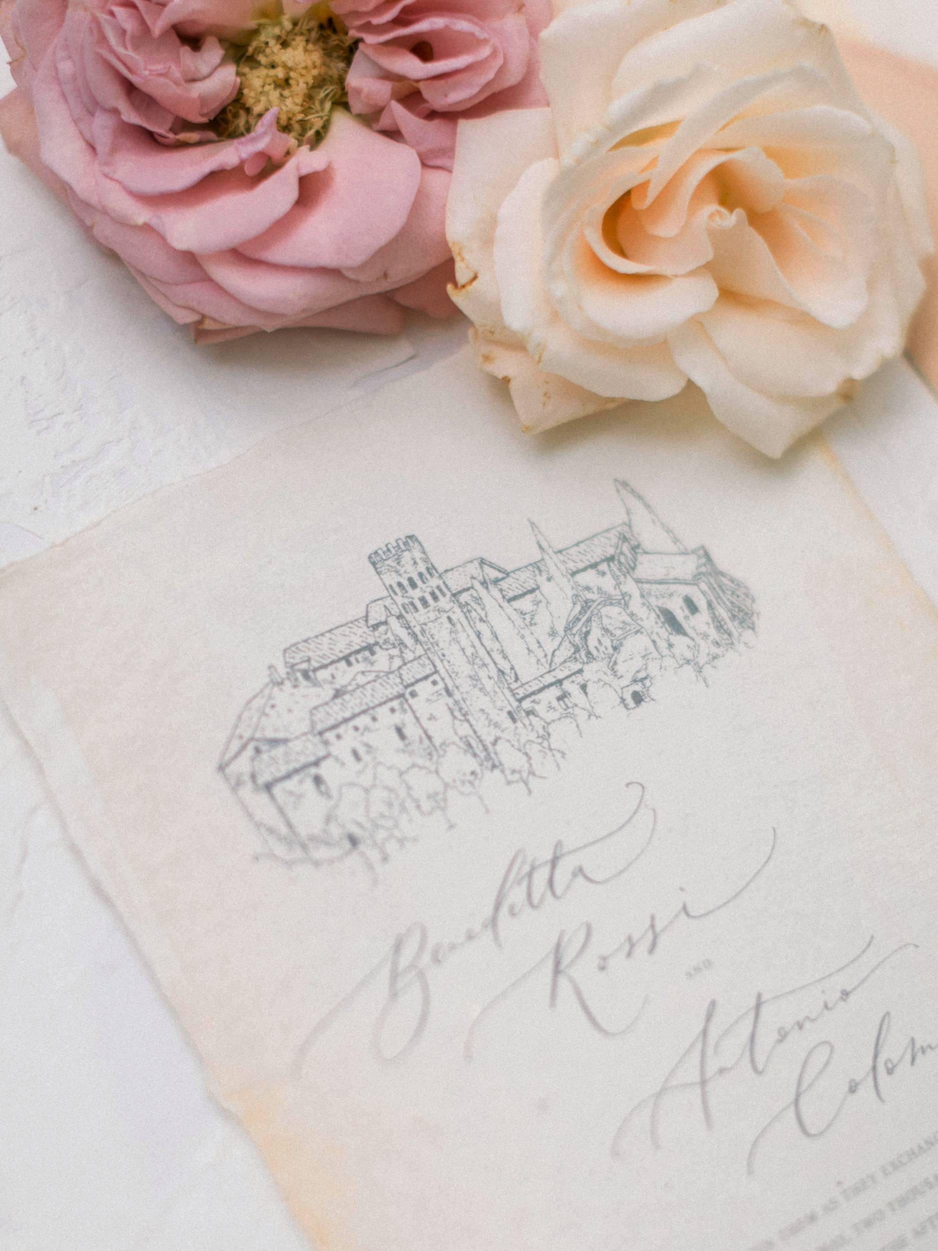Event Venue: La Badia di Orvieto | Photographer: Jeannemarie Photography | Floral Designer: Designs by Hemingway | Dress Designer: Claire Pettibone | Dress Designer: Carol Hannah | Heirlooms and extras: NoonOnTheMoon | Groomsman Attire: Zara | Equipment Rentals: Preludio Divisione Noleggio | Linens and Coverings: The Wedding Linen Company | DIY or Handmade Goods Designer: Silk and Willow | Calligrapher: Theo Berry Stationery| Makeup Artist: Makeup Florence | Hair Stylist: Frank Giacone