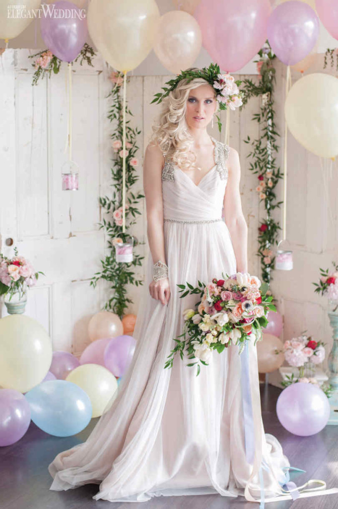 Celebrating lush blooms, pastels and more importantly true love, this “Flower Child” style shoot shows that elegance and nature can work together in perfect harmony. Tumbling vines and bright balloons leave a mark on all elements, from flowers on the cake and personalized drinks to the décor of the altar and invitations. While traditional brides may wear veils or diamond headpieces on their wedding day, this boho bride is all about flower crowns. Intricately woven to rest sweetly on top a bride’s head, the flower crowns are meant to bring together the carefreeness of boho life with the beauty of gardens. And with a warm and cheerful ambiance, this bride is delighted to incorporate qualities of the outdoors to her bubbly indoor celebration.