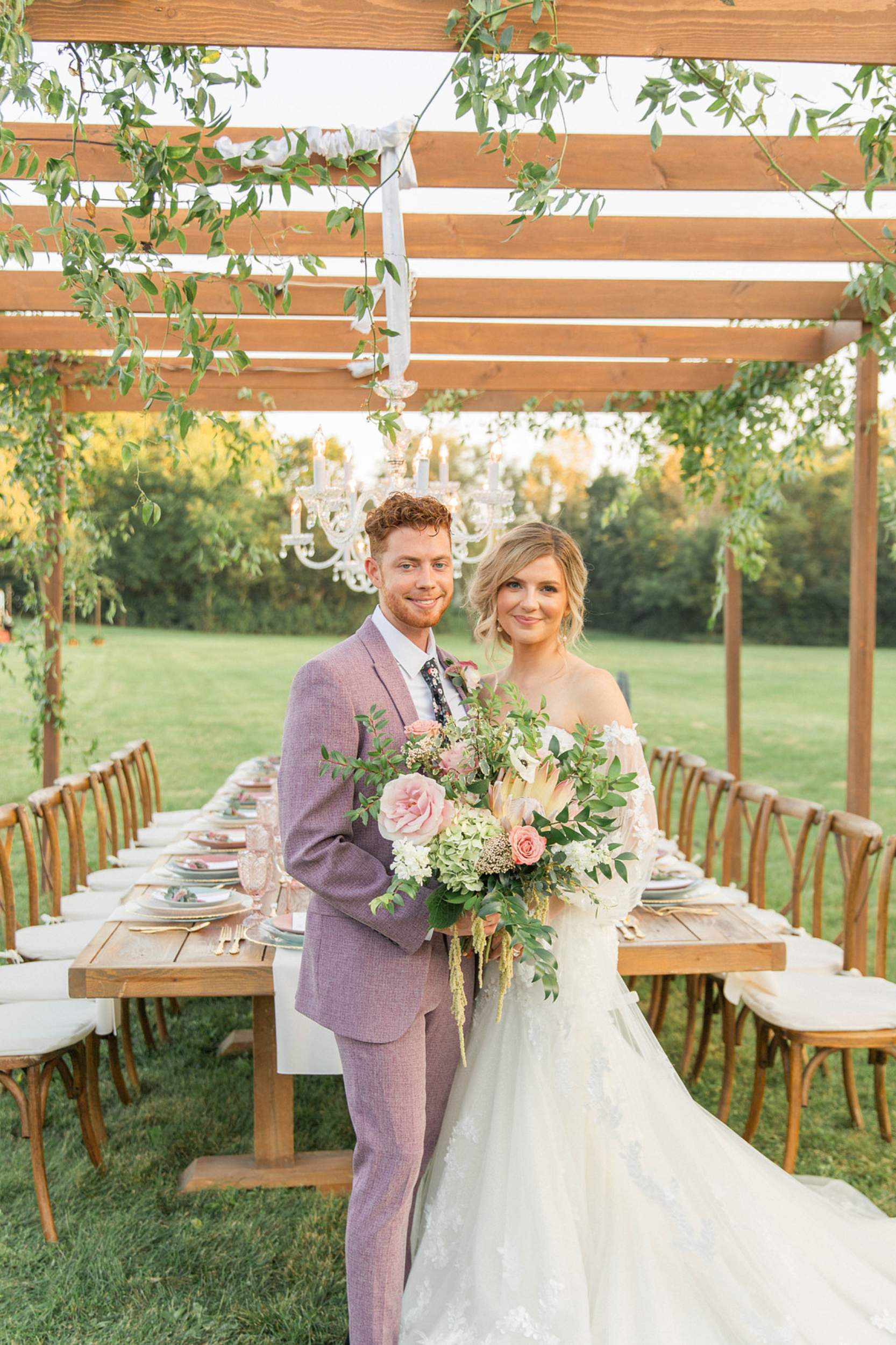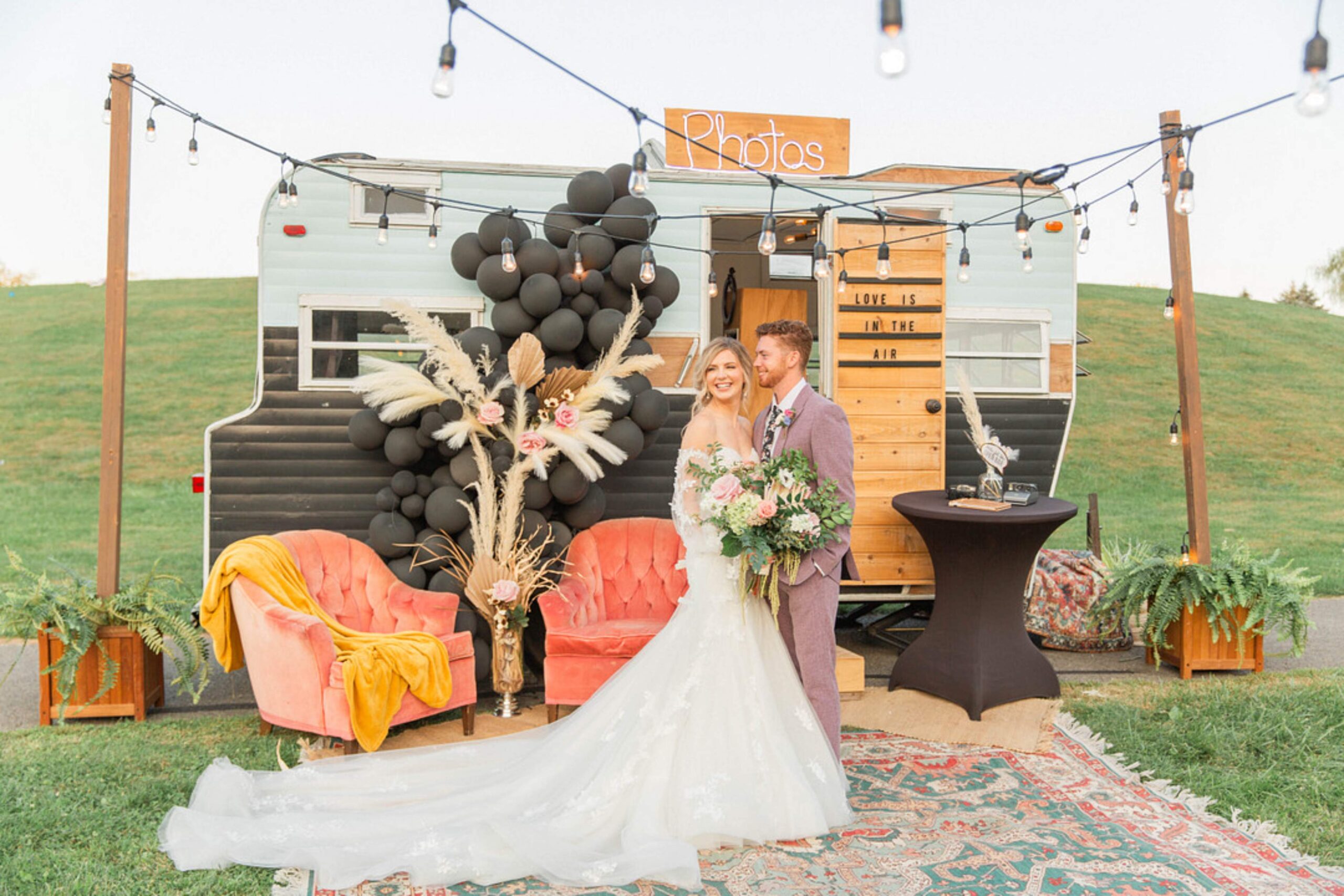 No matter where you choose to say “I do,” you can transform any location into a romantic, whimsical setting that brings your fairytale wedding to life—even if that location is an open field. Imagine your guests dining at a king’s table made from reclaimed barn wood, under a custom-built vineyard trellis adorned with sparkling chandeliers. Our bohemian-meets-whimsical styled shoot demonstrates how incorporating beautiful vintage furniture, stunning pastel florals, eclectic mismatched china, a vintage camper turned mobile photo booth, a live painter capturing every detail, and, of course, a hot air balloon can create an unforgettable guest experience.