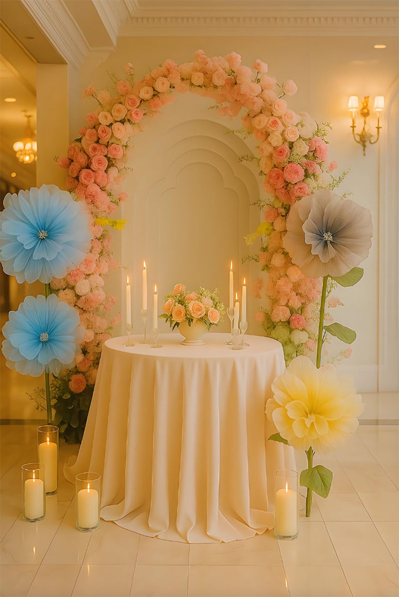 Floral-covered archways act as both entry and photo backdrop. Use wrought iron or wooden trellises wrapped in climbing roses for a vintage European aesthetic.