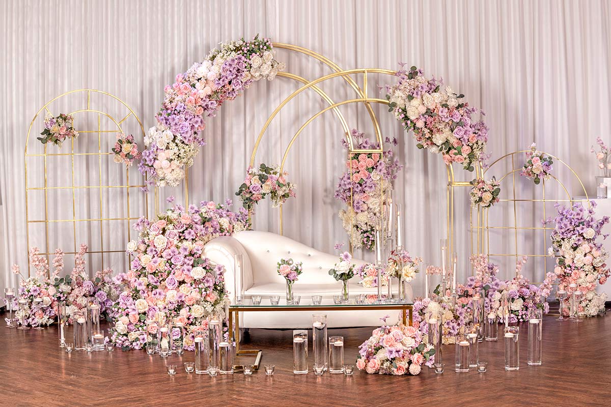 To begin with, the floral arrangements steal the show. Soft lavender, blush, and ivory flowers create a dreamy backdrop. Meanwhile, golden arches add height and elegance to the space. In addition, blooms cascade gracefully to frame the couple beautifully.