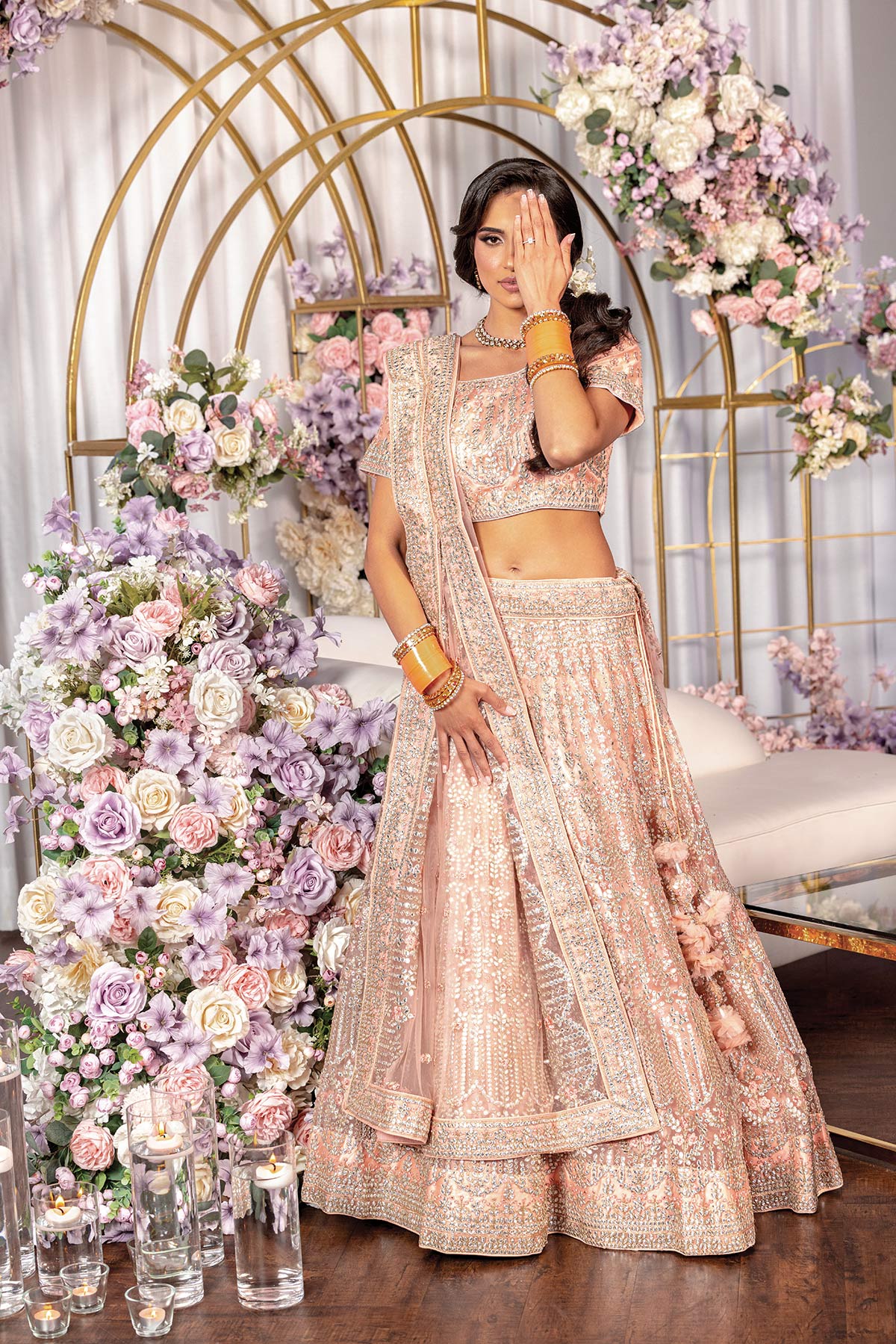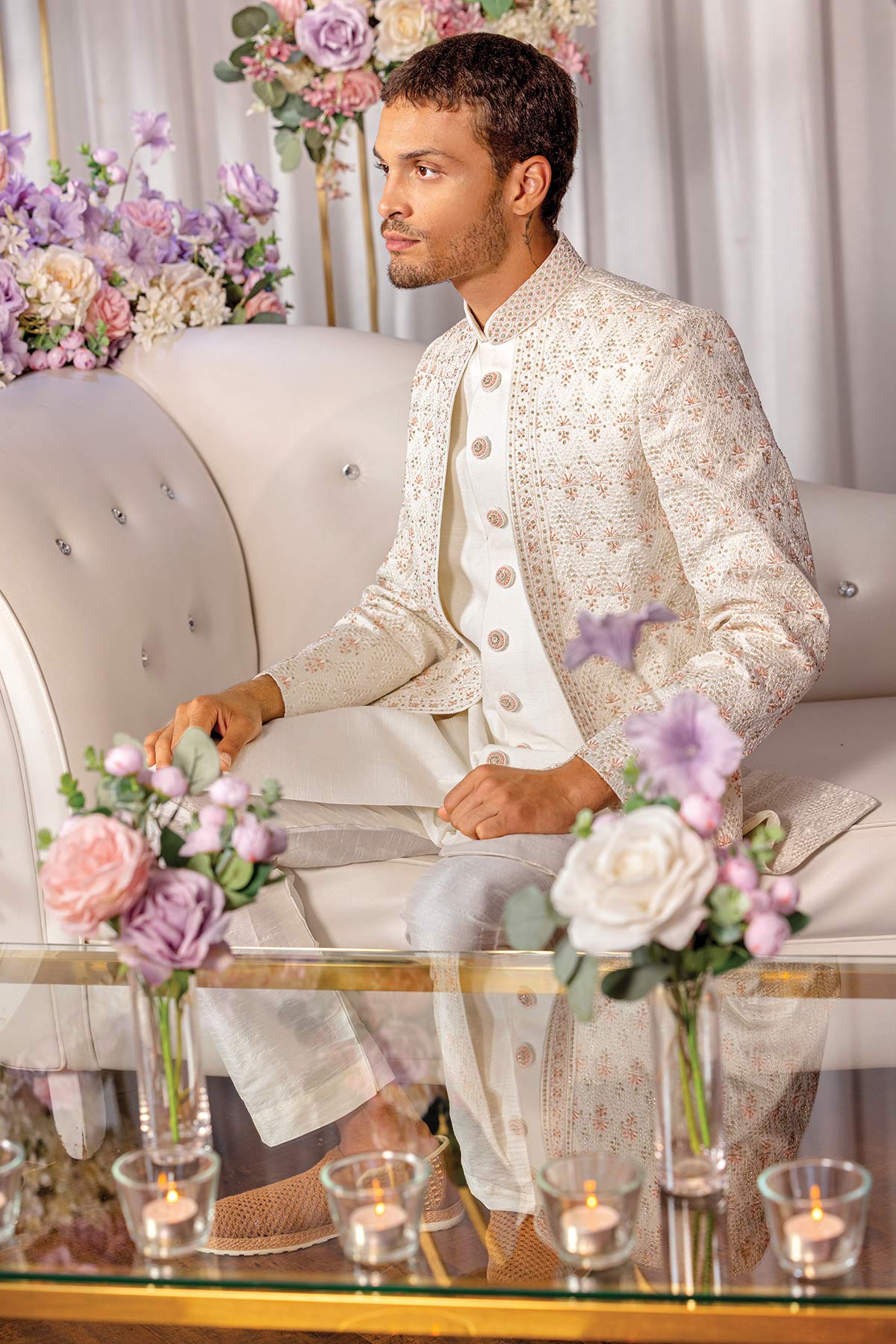 The bride stuns in a peach lehenga with detailed embroidery. Meanwhile, her hairstyle adds a glamorous yet classic touch. Her jewelry, though bold, complements the soft tones beautifully. The groom, on the other hand, looks regal in a cream sherwani. Together, they perfectly blend tradition with modern style.