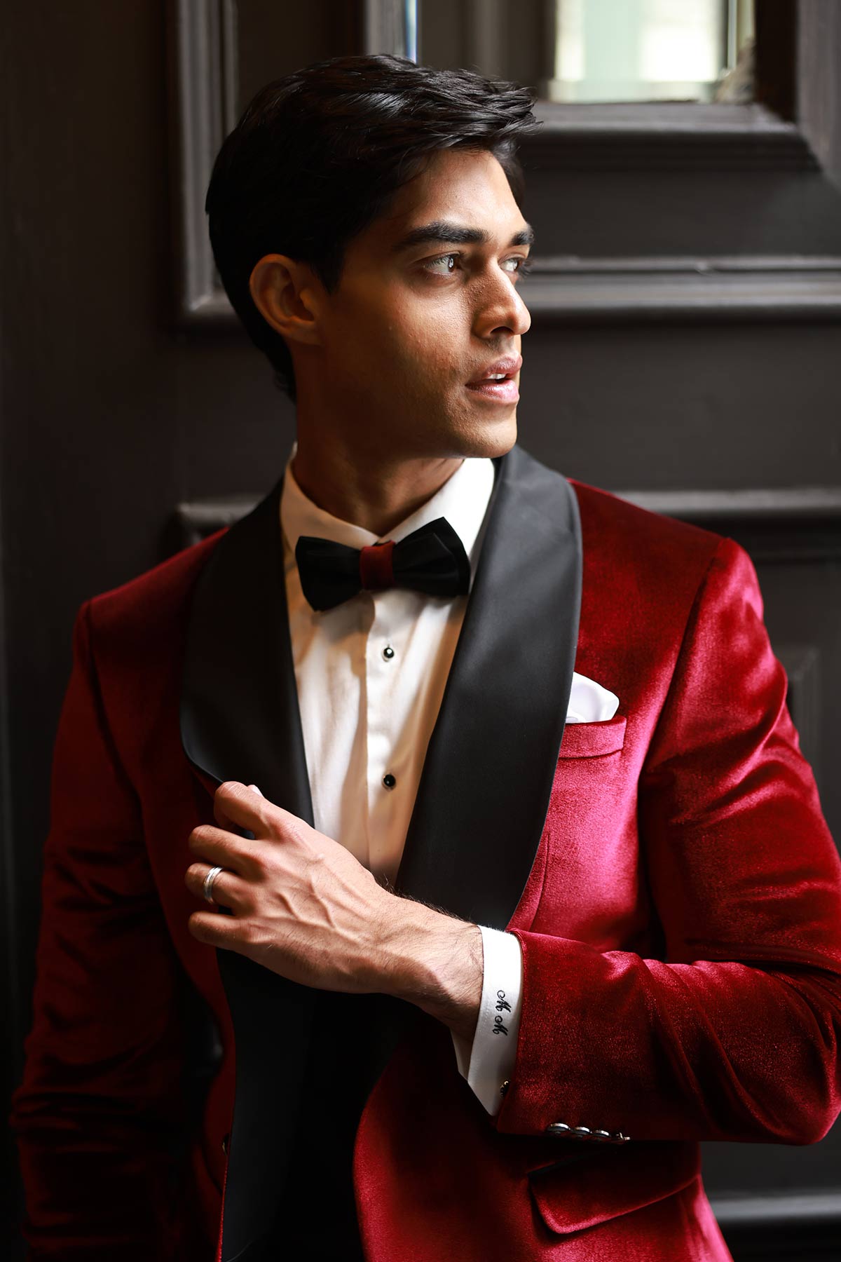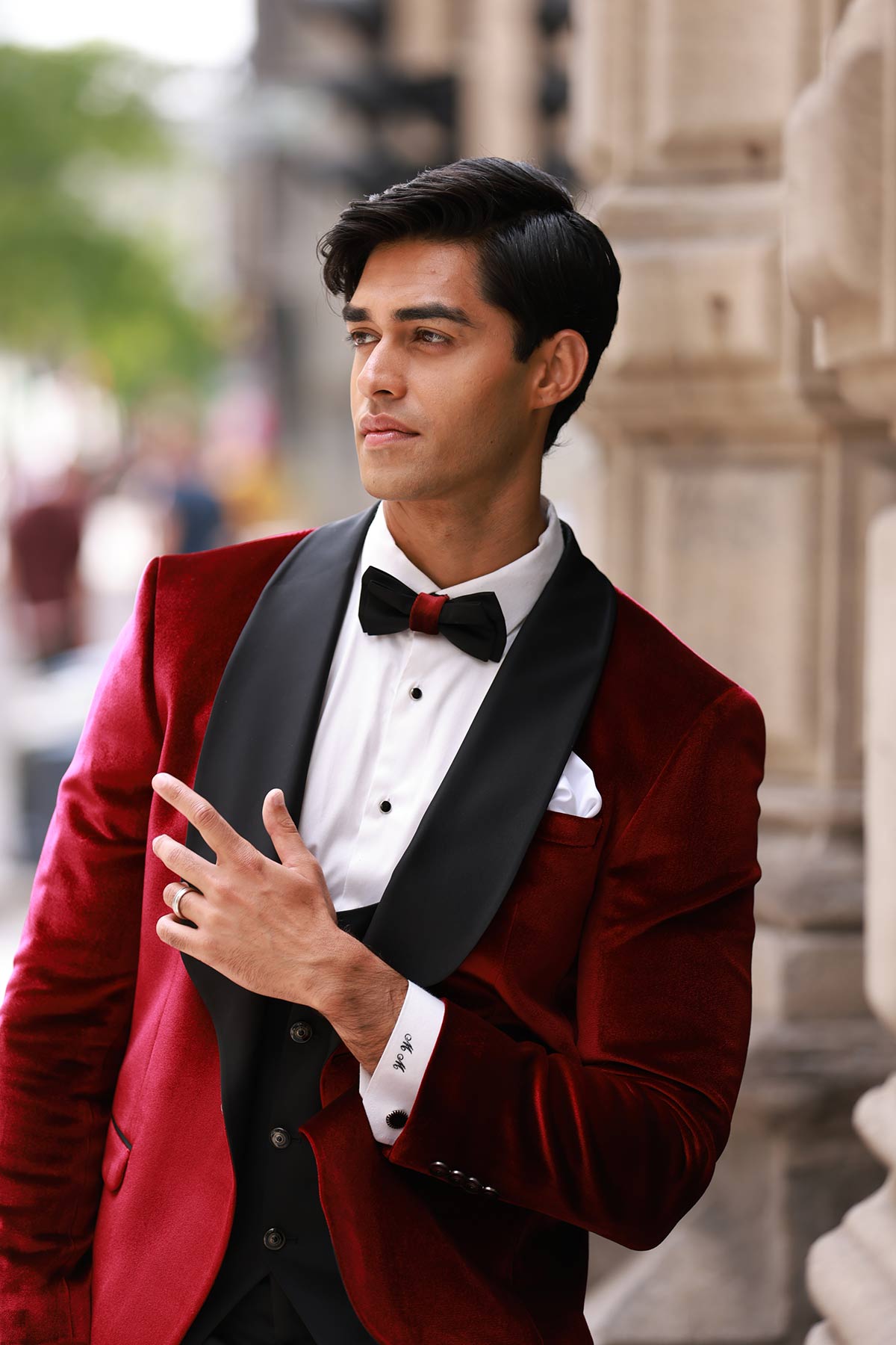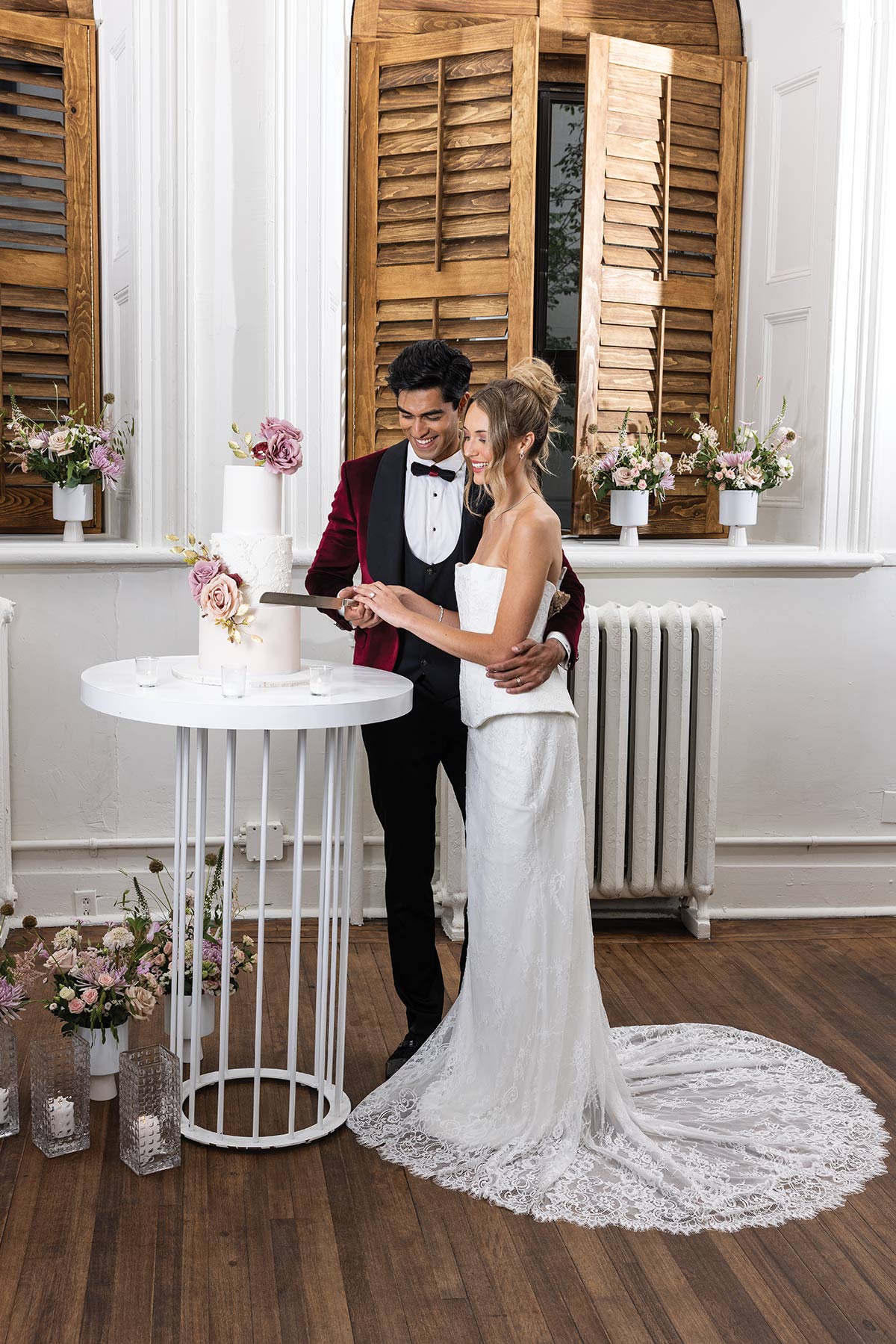 The bride stuns in a delicate lace gown with clean lines, while the groom makes a bold yet chic statement in a blush pink tuxedo jacket—proof that modern couples aren’t afraid to add personality to tradition.