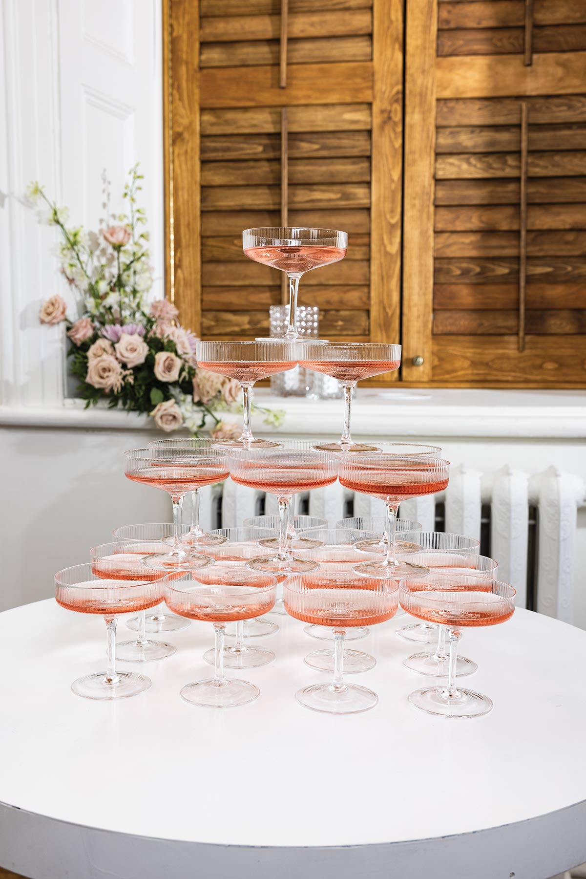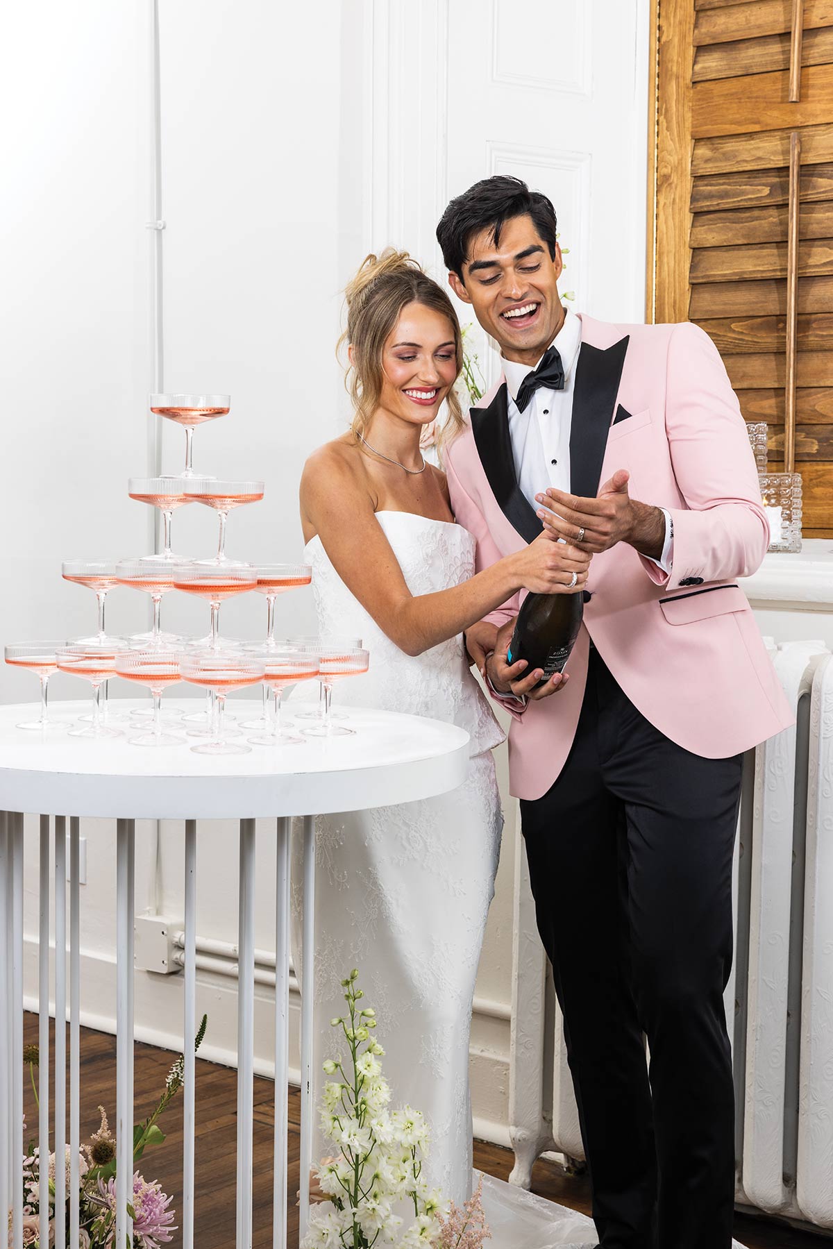 Minimal white tables, soft pink linens, gold accents, and airy floral arrangements set the tone for an elevated yet inviting reception. From the sculptural ceremony florals to the playful champagne tower, every detail was designed to feel intentional, stylish, and celebratory.