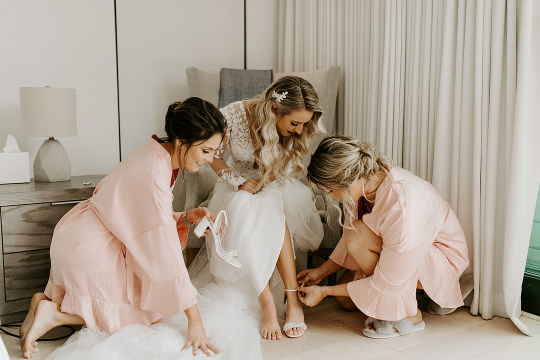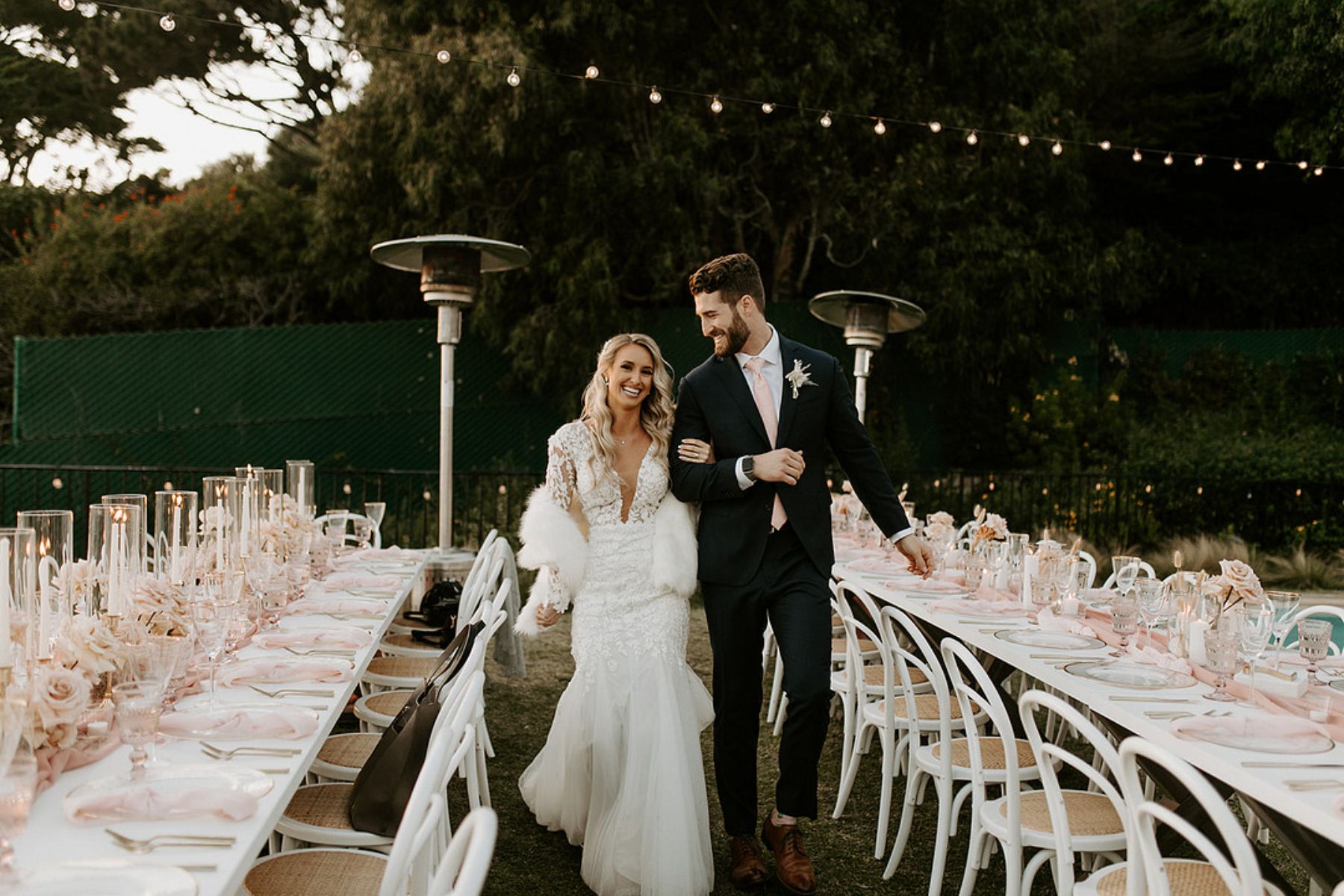 The coastal setting spoke for itself, so décor was kept simple and elegant with soft blush tones, acrylic details, and floral arrangements that transitioned seamlessly from ceremony to reception. The bride carried a bouquet of blush and toffee roses, orchids, and pampas grass, while the groom looked sharp in his custom-tailored suit.