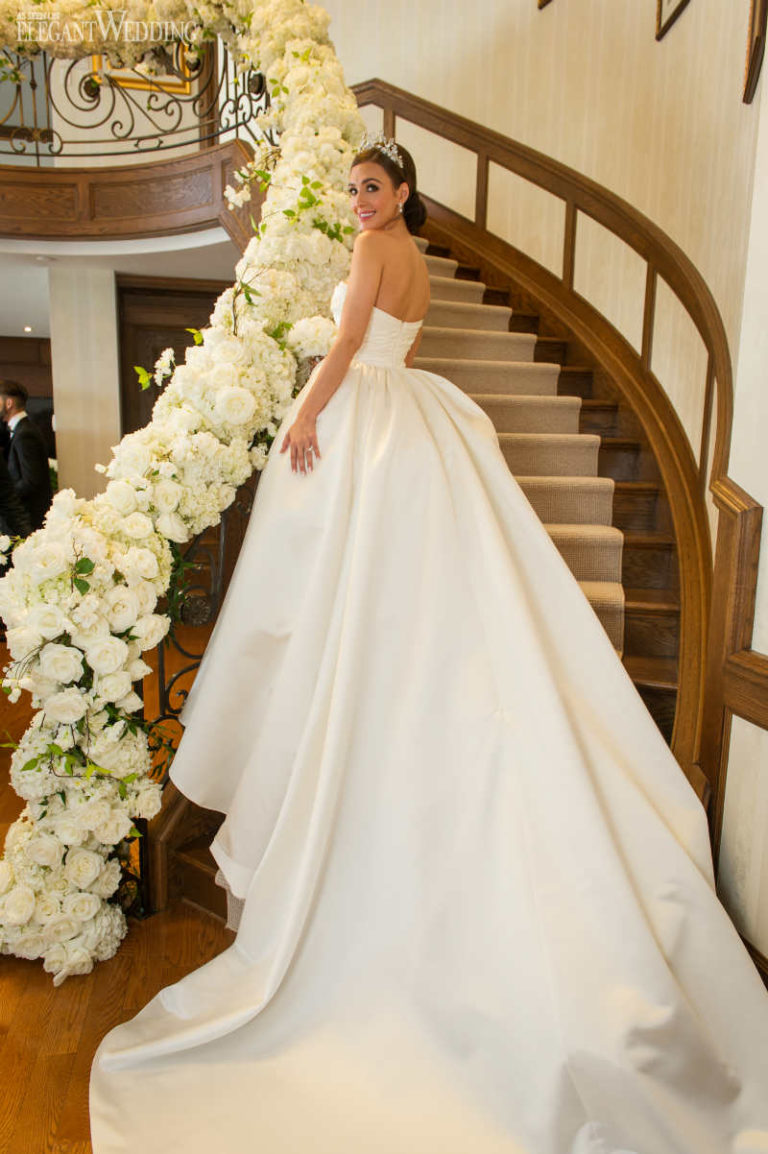 Every facet of bride Alex’s pastel wedding at the Ritz-Carlton in Montreal embodied regal luxury. Using a palette of ivory, pink and gold, decor consisted of a spectacular floral staircase, monogrammed dance floor and incredible 10-tier wedding cake. Following the traditional church ceremony, guests made their way to the romantic reception where a show-stopping floral canopy centrepiece with hanging glass bulbs was placed at the centre of the bridal party table. At the newlywed’s sweetheart table, a row of cascading white orchids served as the centrepiece. With a sweeping train and elegant tiara, Alex could easily have passed for a princess!