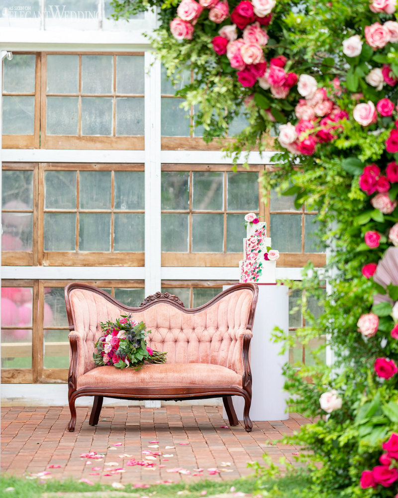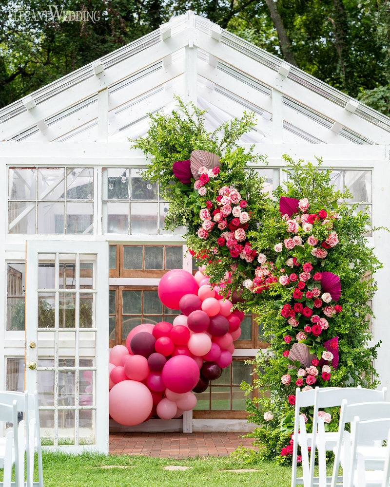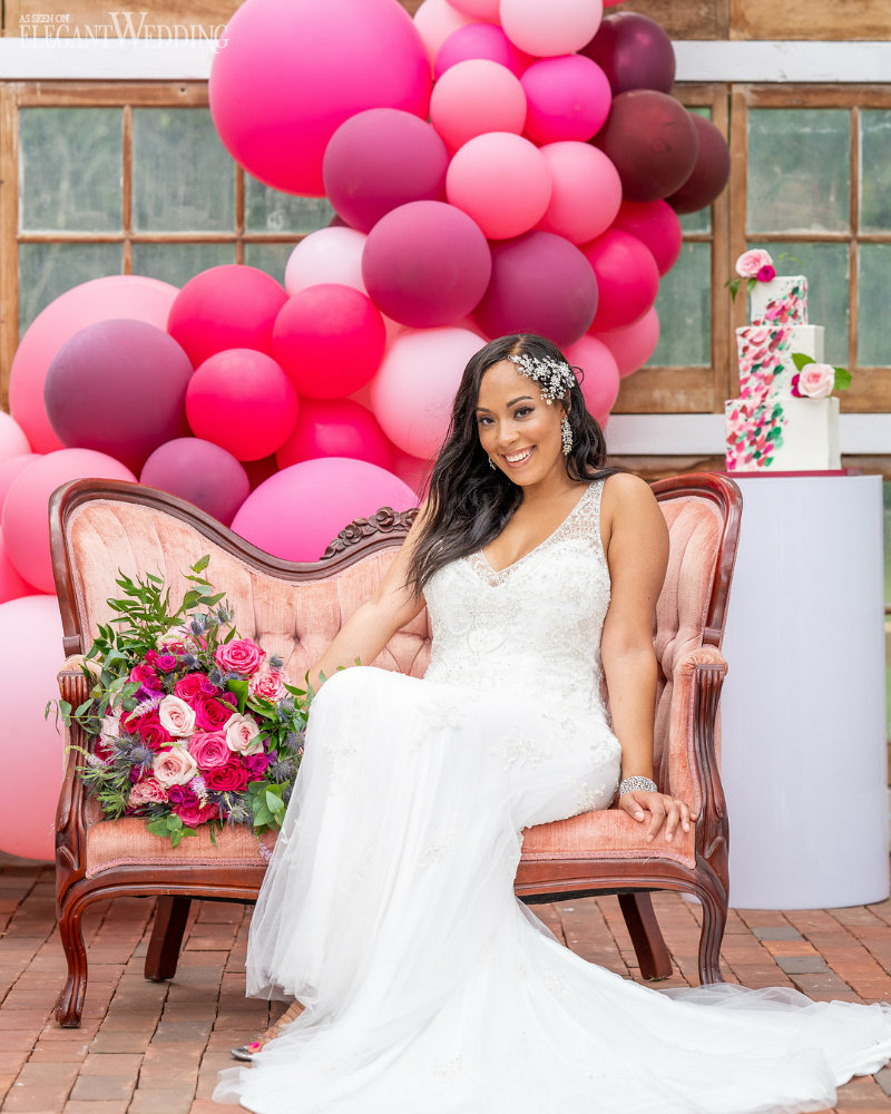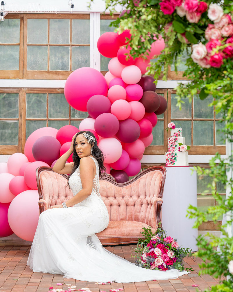 This pretty style shoot showcases some fun elements, from the giant balloon Garlin to the pretty pink and white cake.
