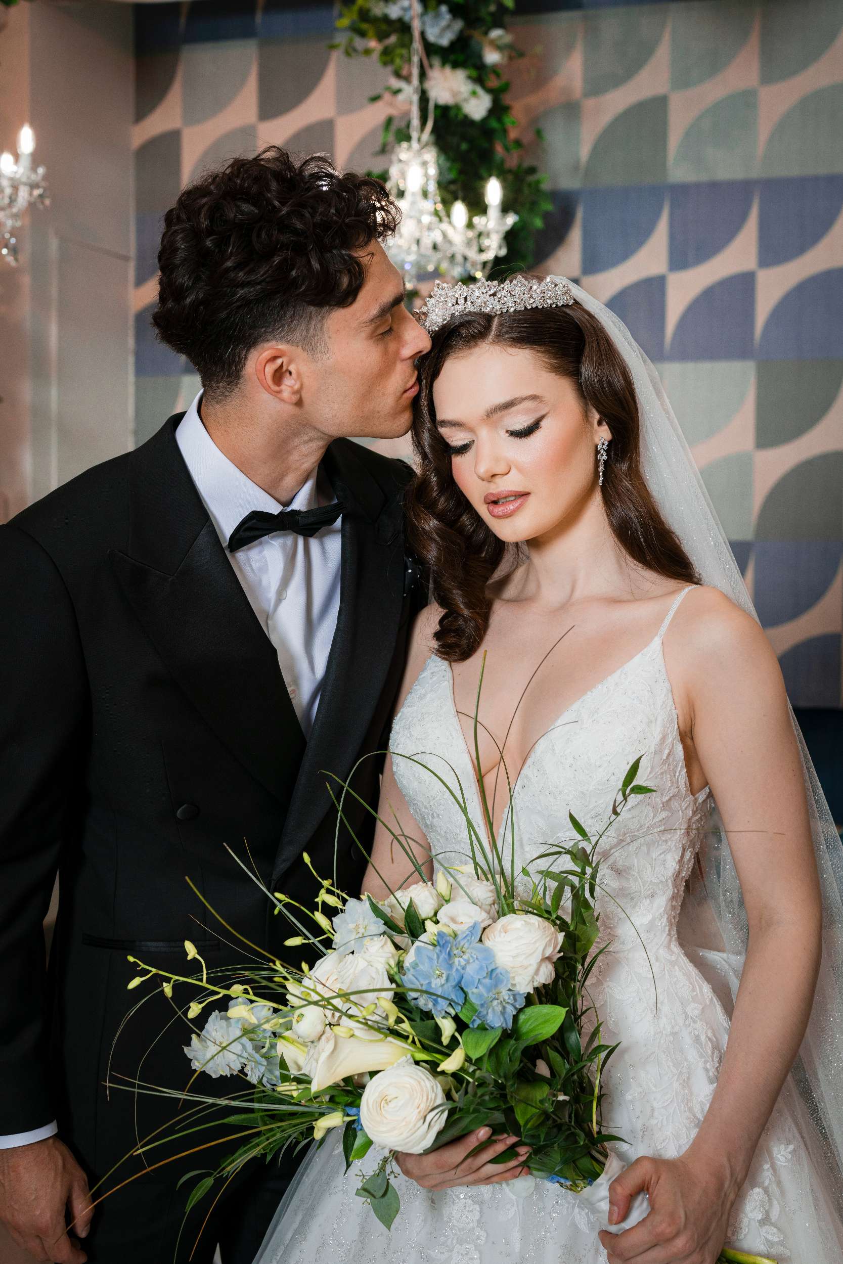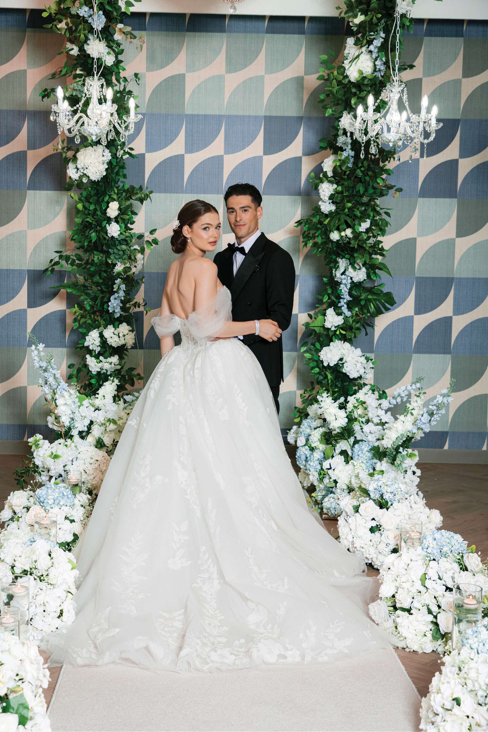 This stunning wedding editorial is a beautiful balance of timeless elegance and modern design. Set beneath sparkling crystal chandeliers and framed by lush floral arches, the space feels romantic, refined, and effortlessly luxurious.