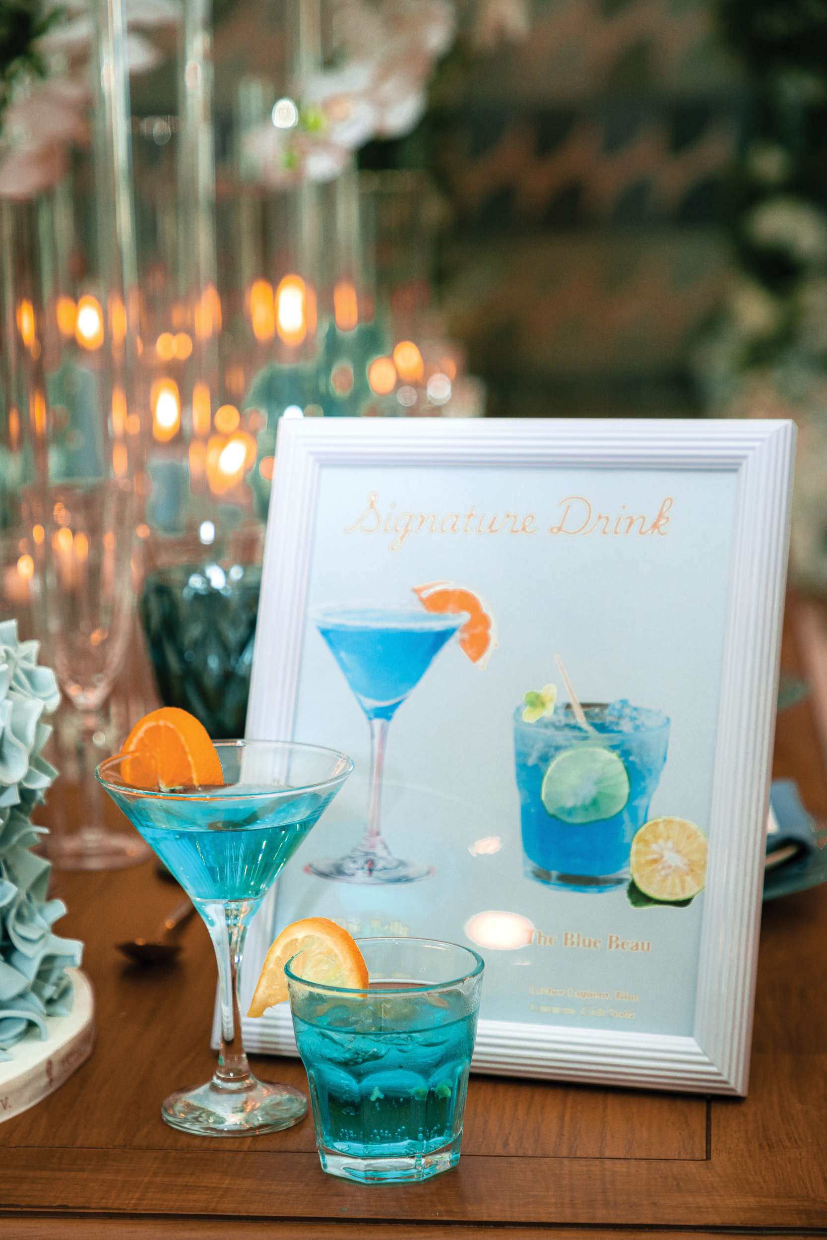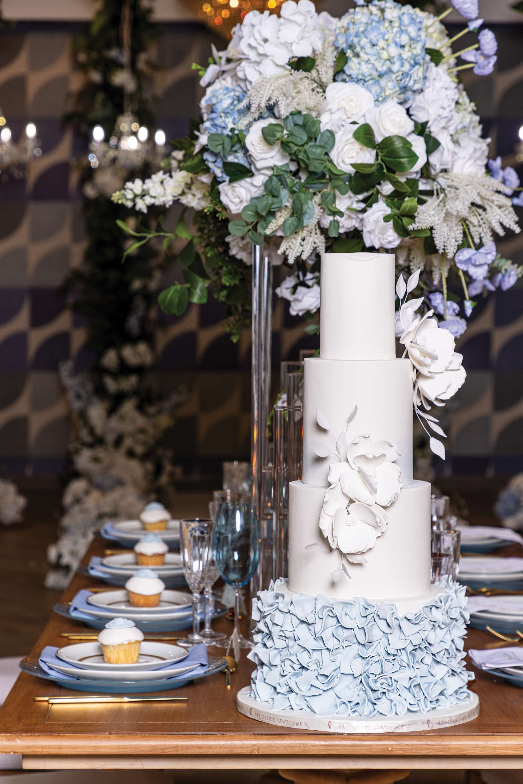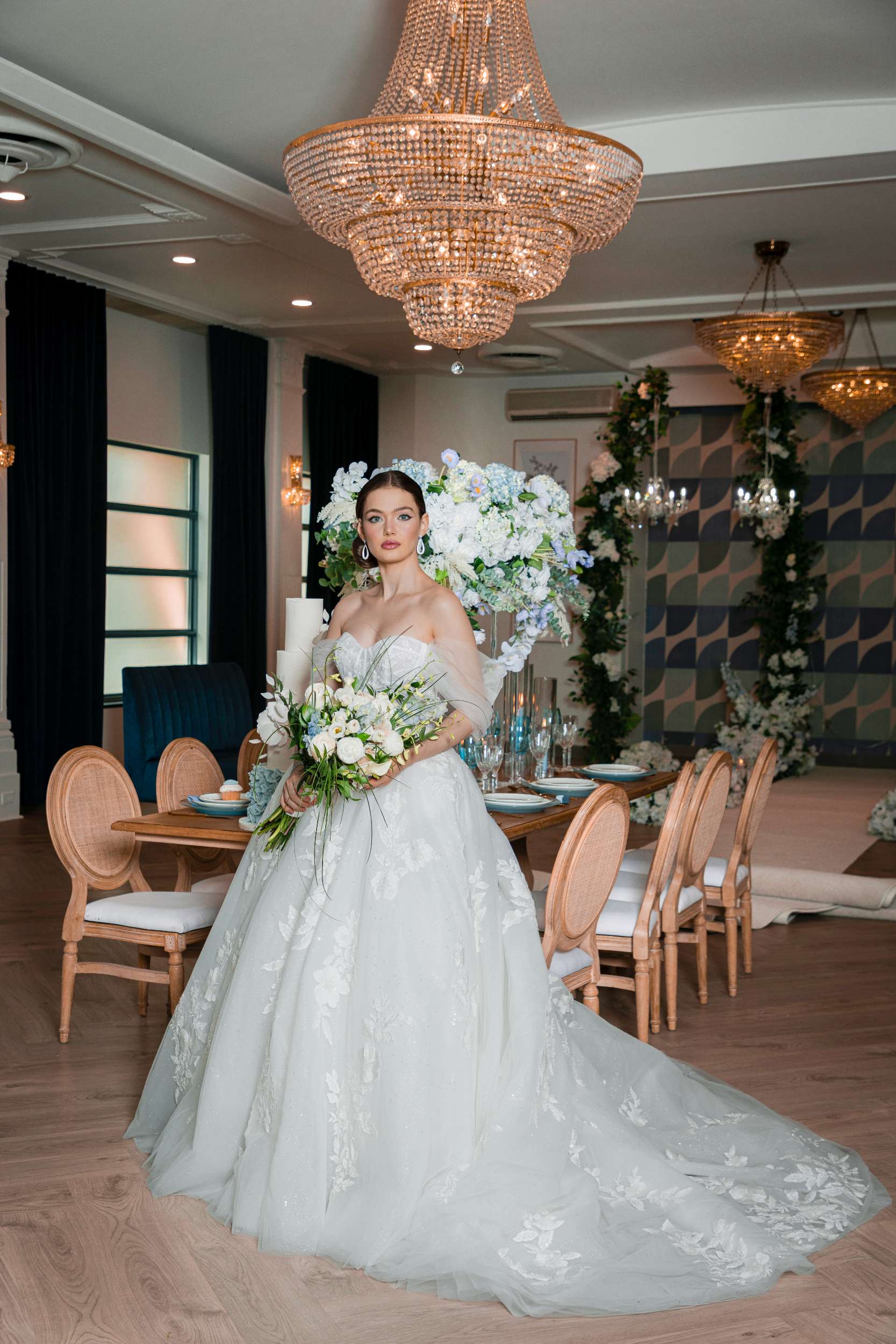 The décor blends warm wood tones with airy white and powder-blue florals, creating a serene palette that feels both elevated and inviting. Tall centerpieces draw the eye upward, echoing the drama of the chandeliers, while candles and elegant place settings add intimate warmth to the tablescape.