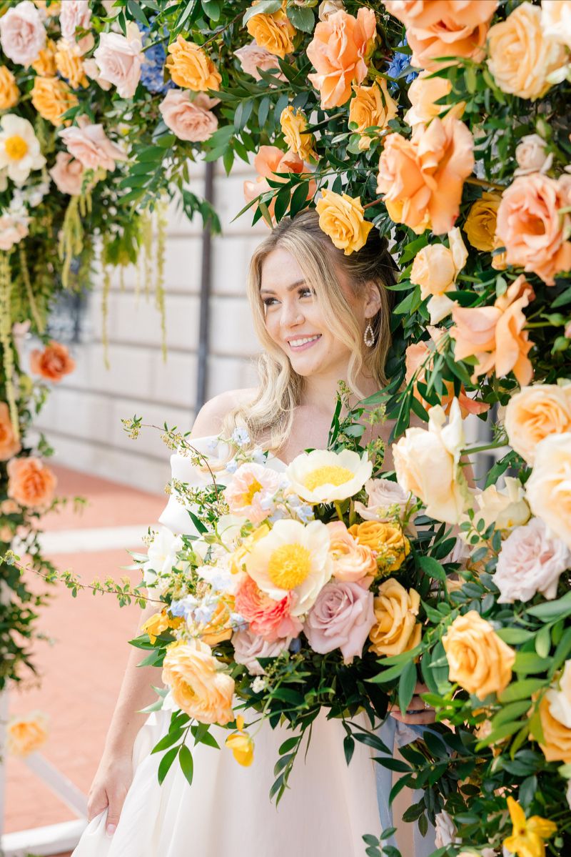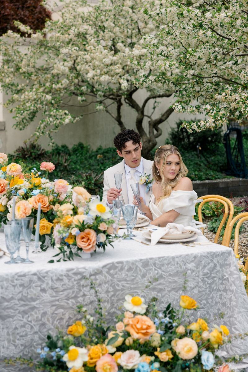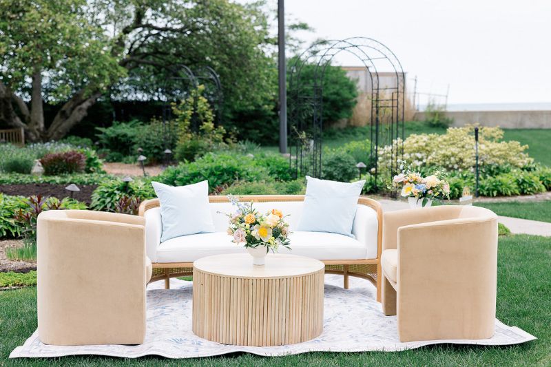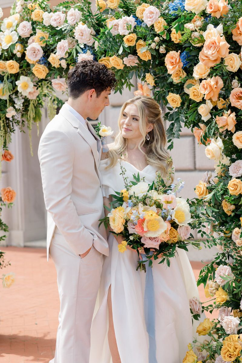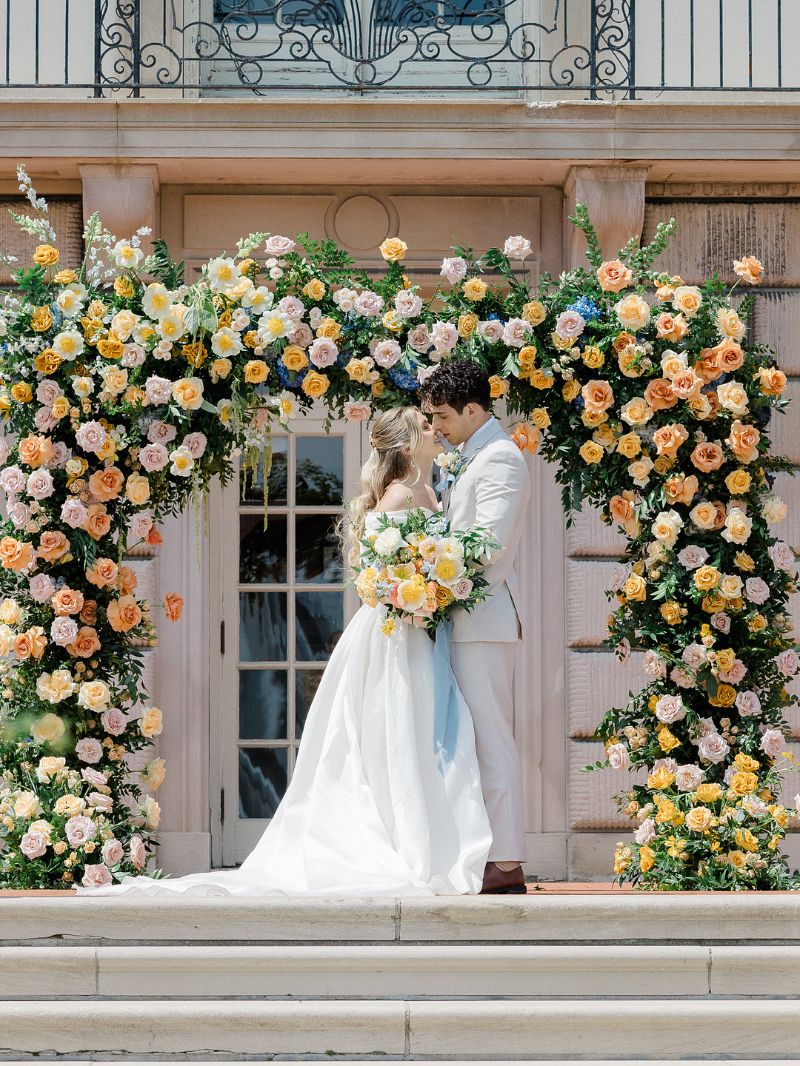 A dreamy spring garden editorial at the historic War Memorial in Grosse Pointe, Michigan. Designed by Heather Benge with Styled Shoots Across America, this styled shoot featured a blooming floral arbor, a romantic satin gown, and a chic tan suit. A lace-detailed cake, champagne toasts, and a 1937 vintage Packard completed the magic. Pure elegance, romance, and sophistication in every detail.
