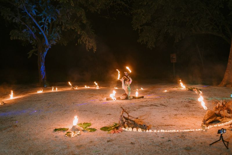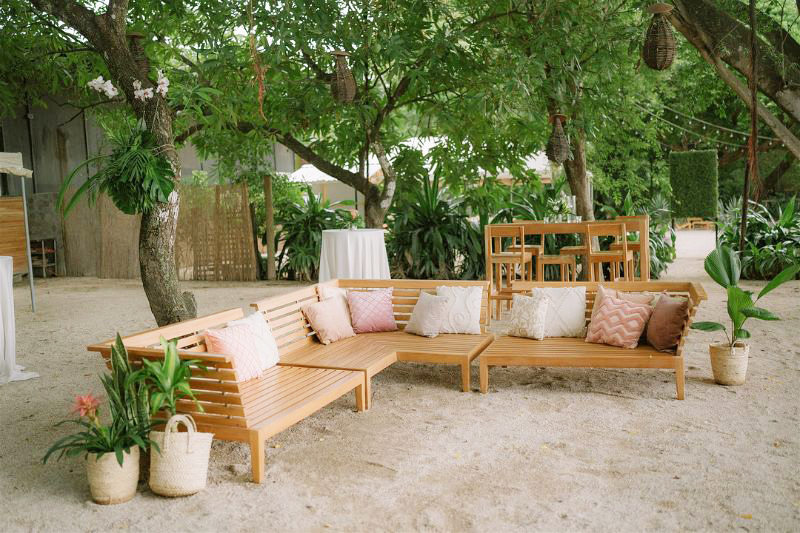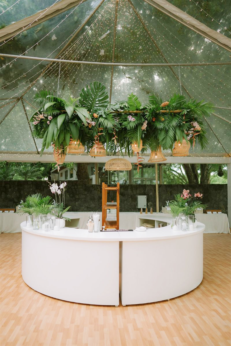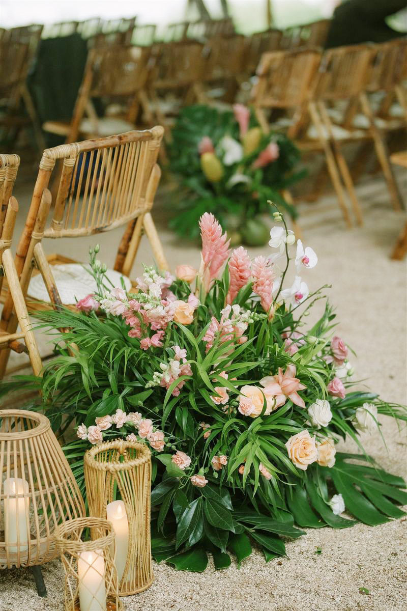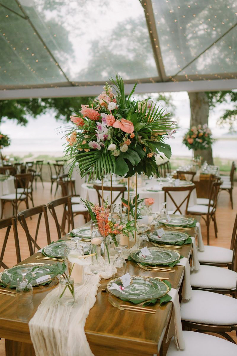 It is all about lush greenery, bold florals, and natural textures like rattan, bamboo, and wood, all set against a backdrop of ocean views or palm-lined spaces. Light, airy fabrics, warm sunset tones, and soft candlelight create a romantic glow, while playful touches such as signature cocktails, fresh-fruit accents, and beachside elements add personality.