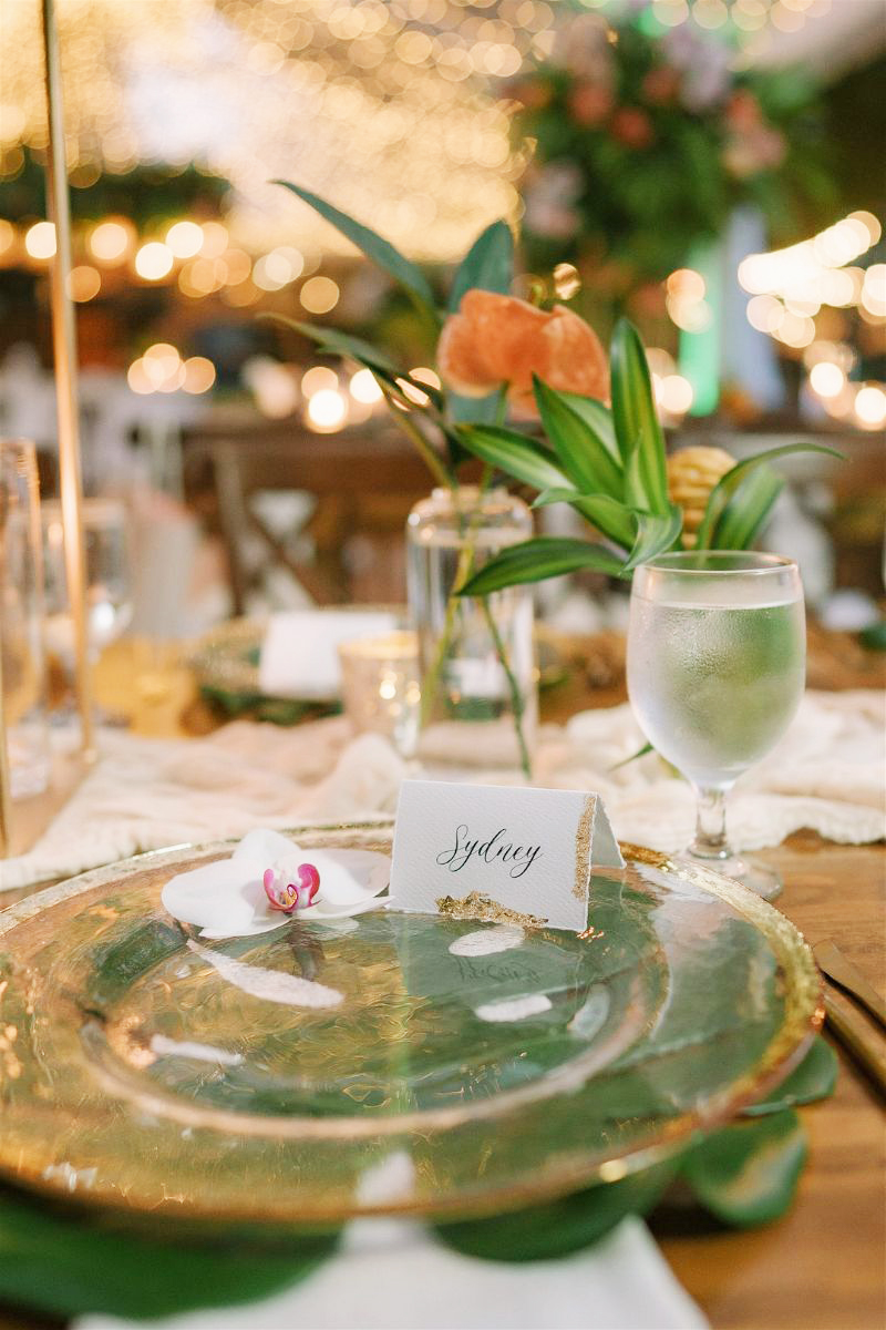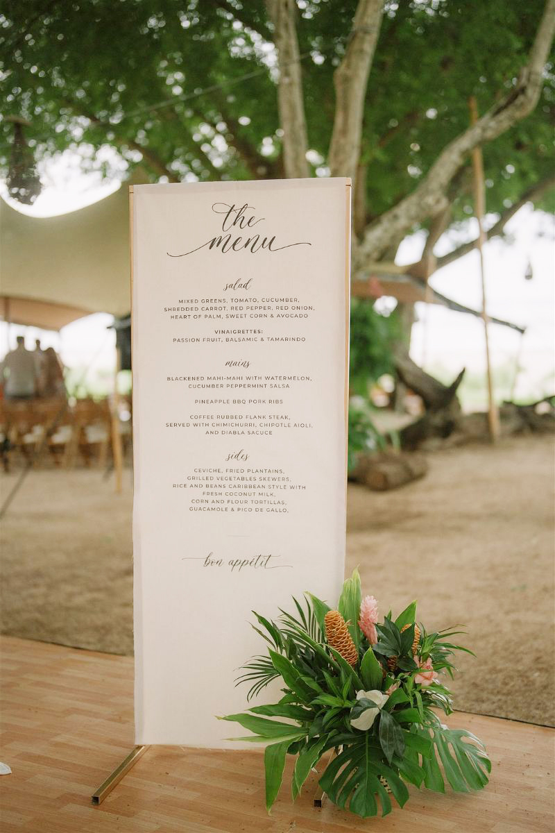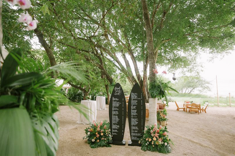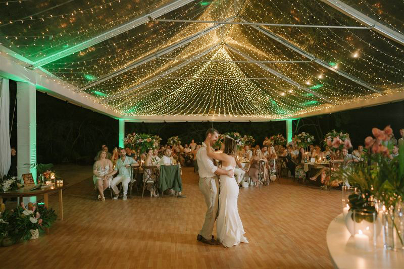 The reception at Pangas Beach Club was filled with thoughtful, personal touches—from a surfboard seating chart to tropical-inspired décor and glowing candlelight under a clear tent. As the evening unfolded, the couple shared their first dance, enjoyed lively entertainment, and celebrated surrounded by family and friends—ending the night exactly as it began: full of love and joy.