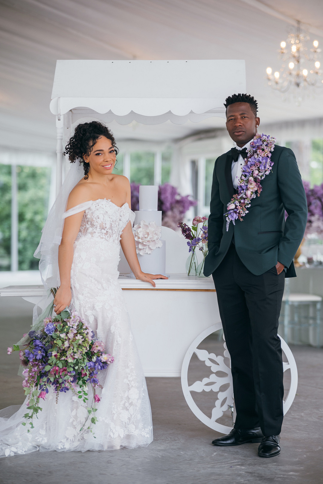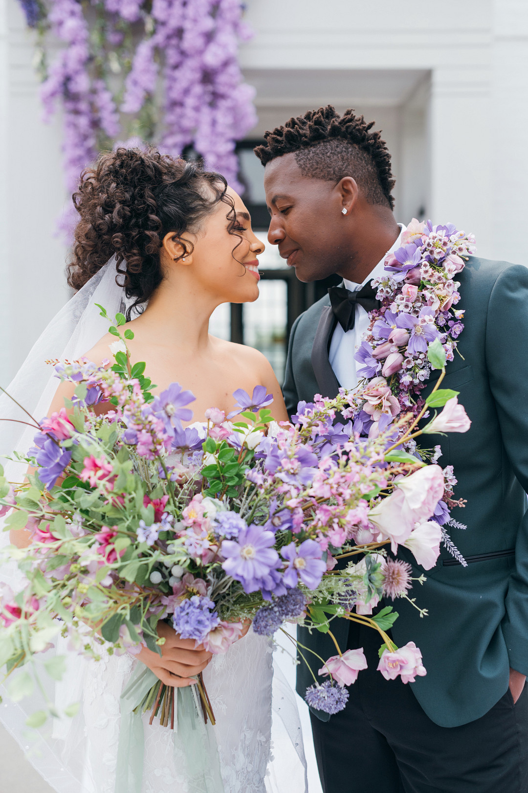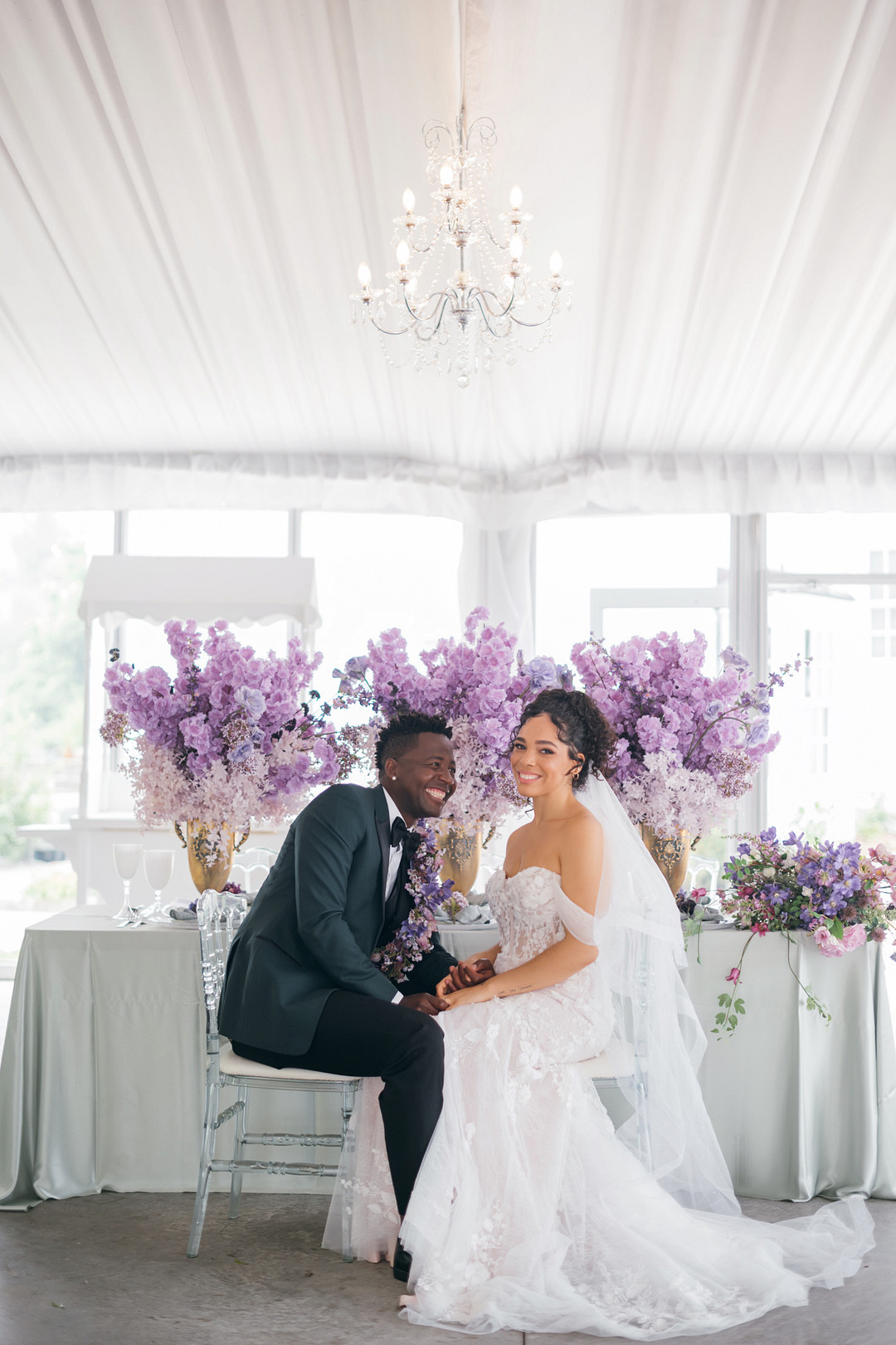 To begin, florals take center stage. Shades of purple bloom everywhere, adding depth and romance. Instead of a classic boutonniere, the groom wears a trailing lapel floral—an unexpected, stylish choice.