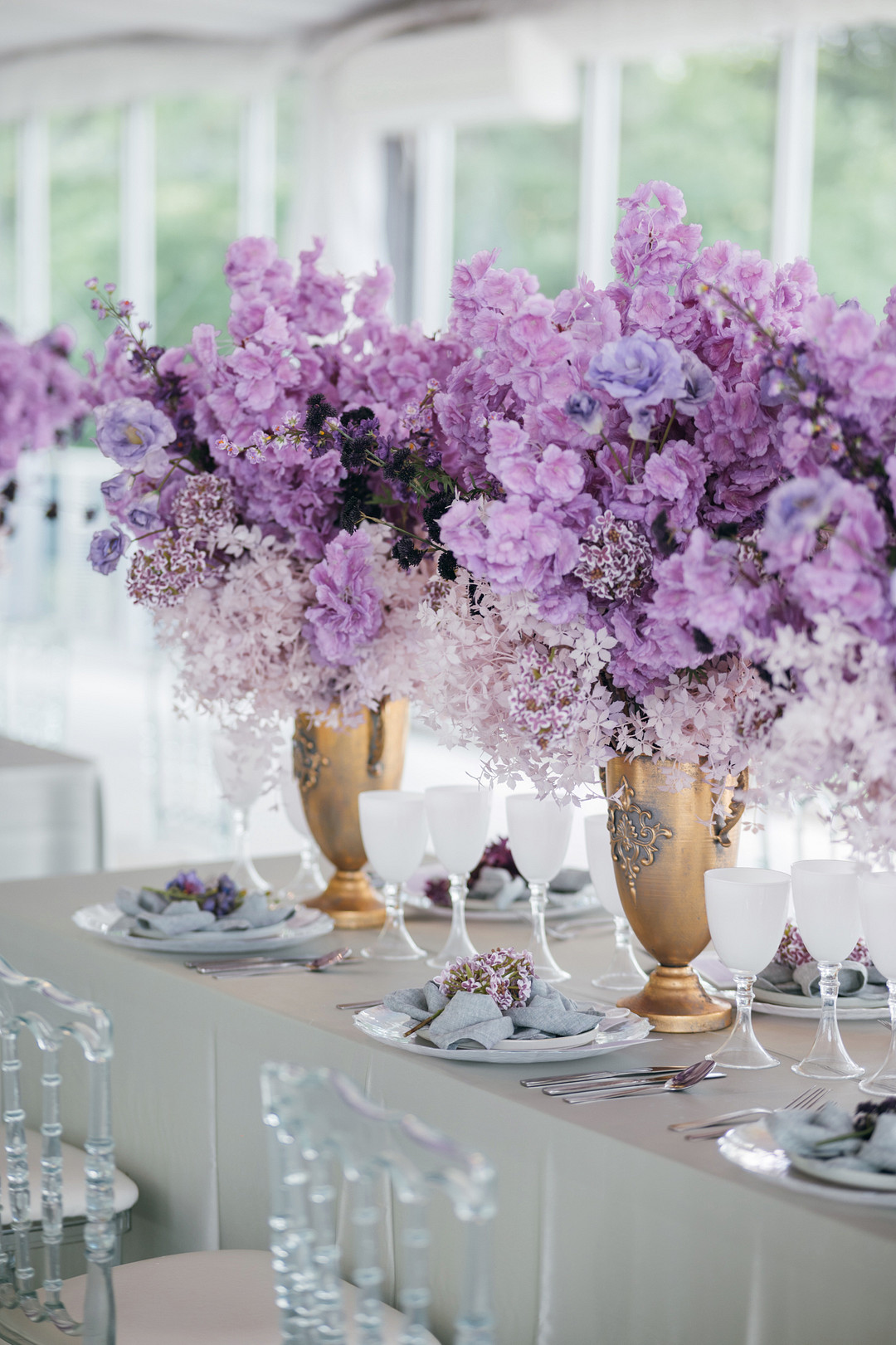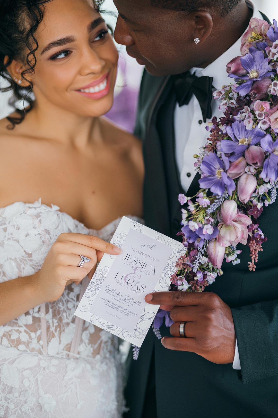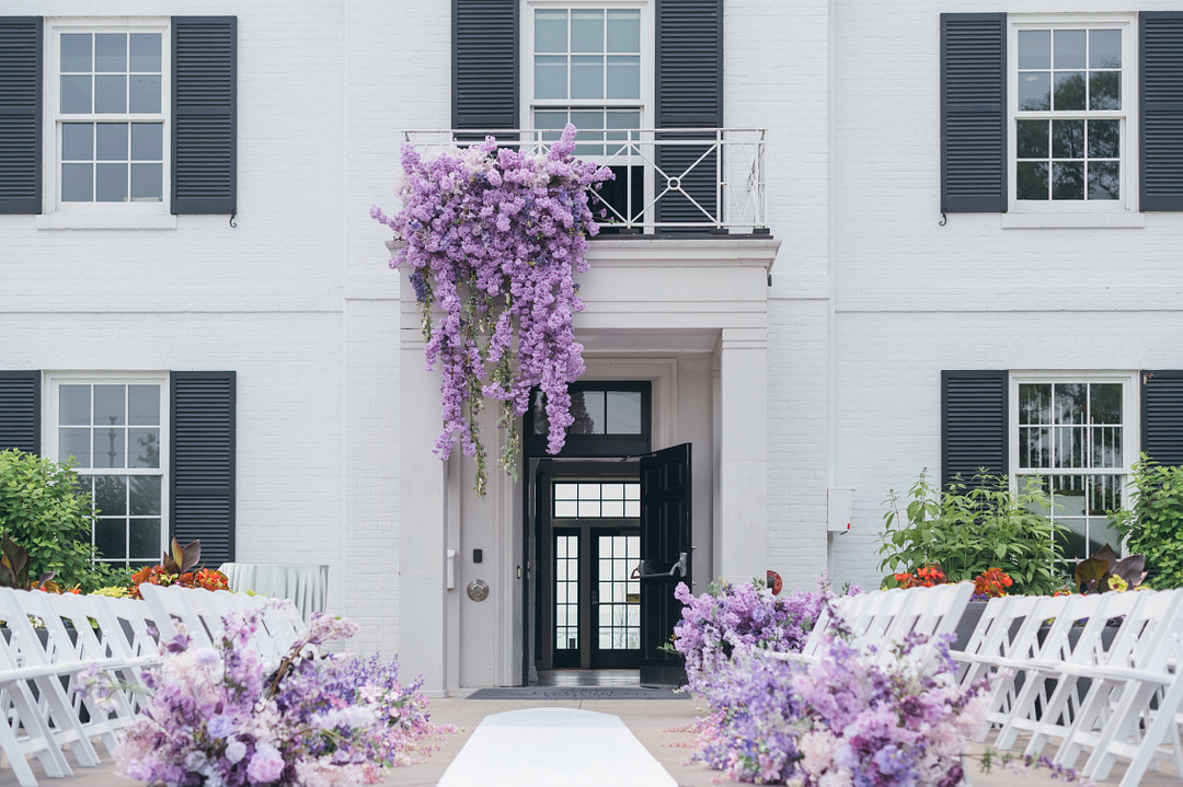 To begin, florals take center stage. Shades of purple bloom everywhere, adding depth and romance. Instead of a classic boutonniere, the groom wears a trailing lapel floral—an unexpected, stylish choice.