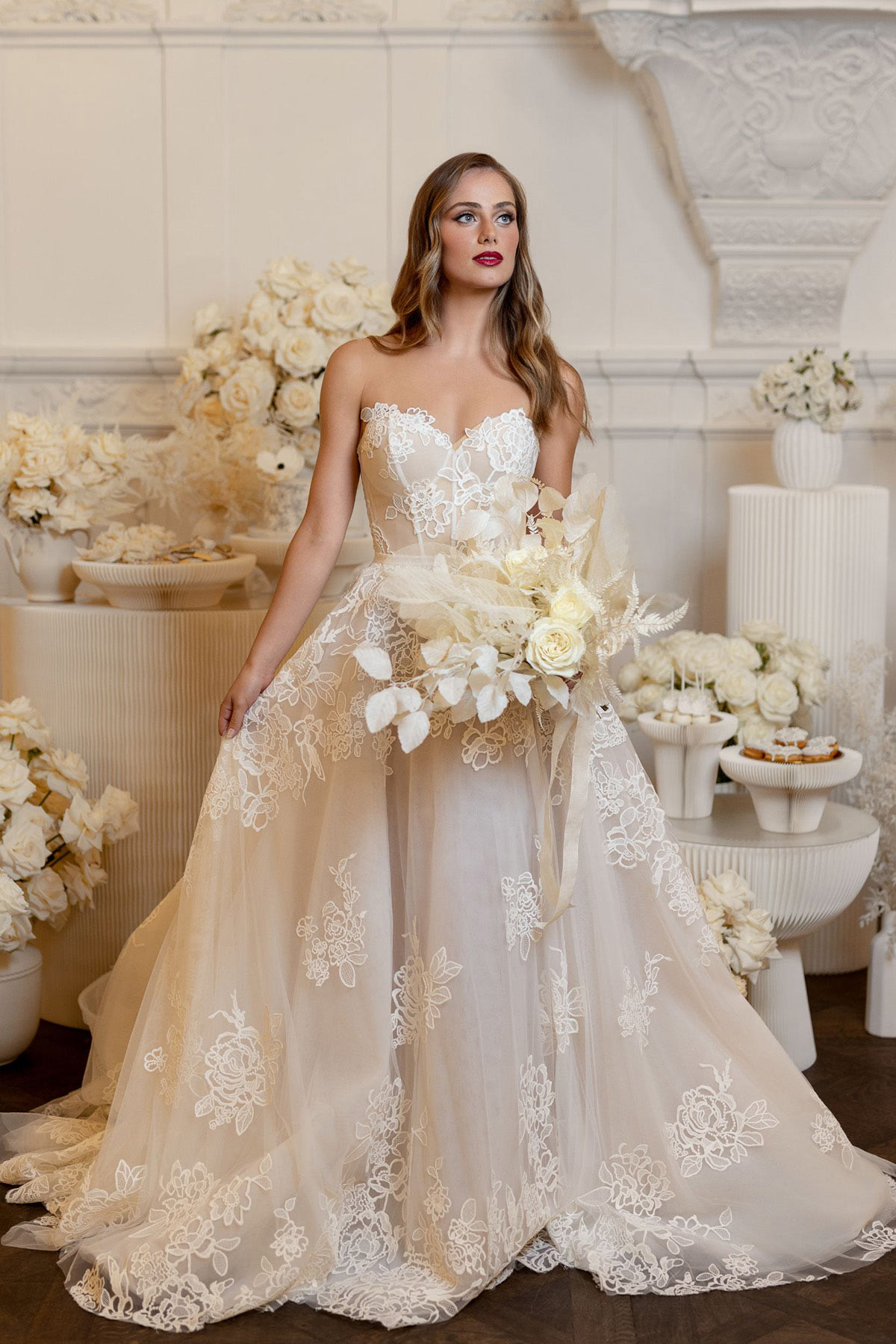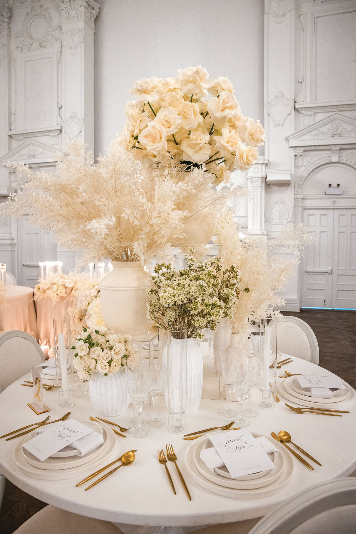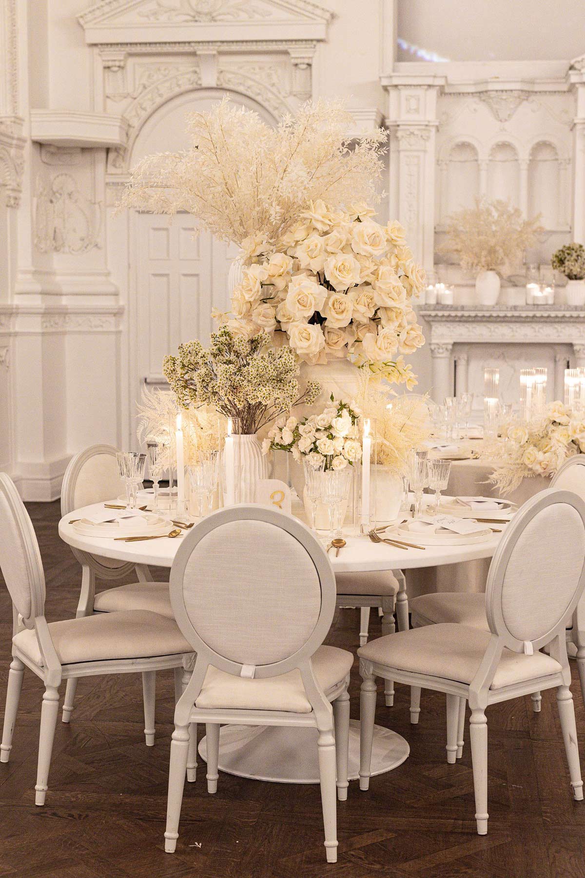 Picture a historic venue with intricate architectural details, soaring ceilings, and chandeliers that glisten under the soft glow of candlelight. This refined setting provides the ultimate backdrop for a white wedding, allowing the neutral hues to shine with unparalleled grace.