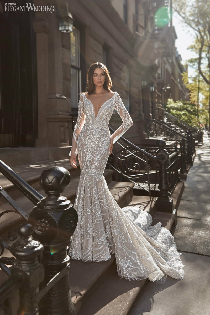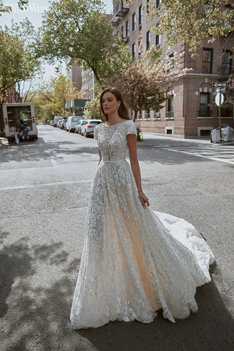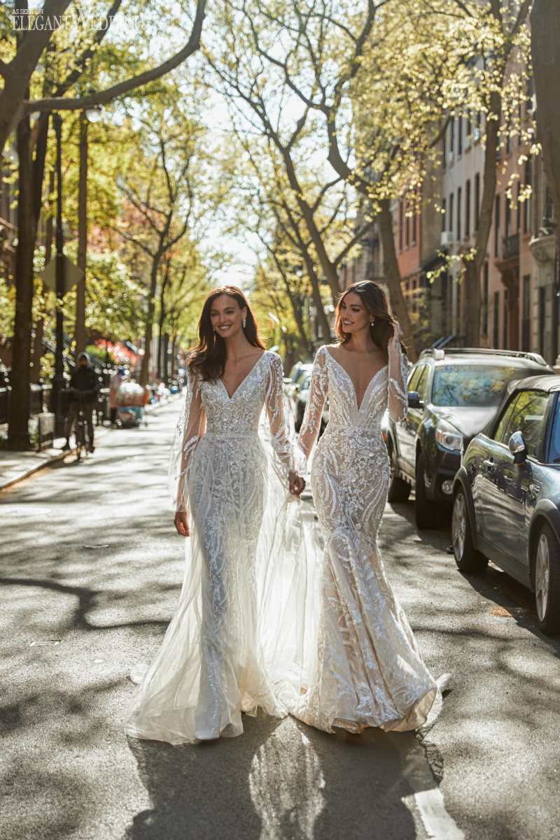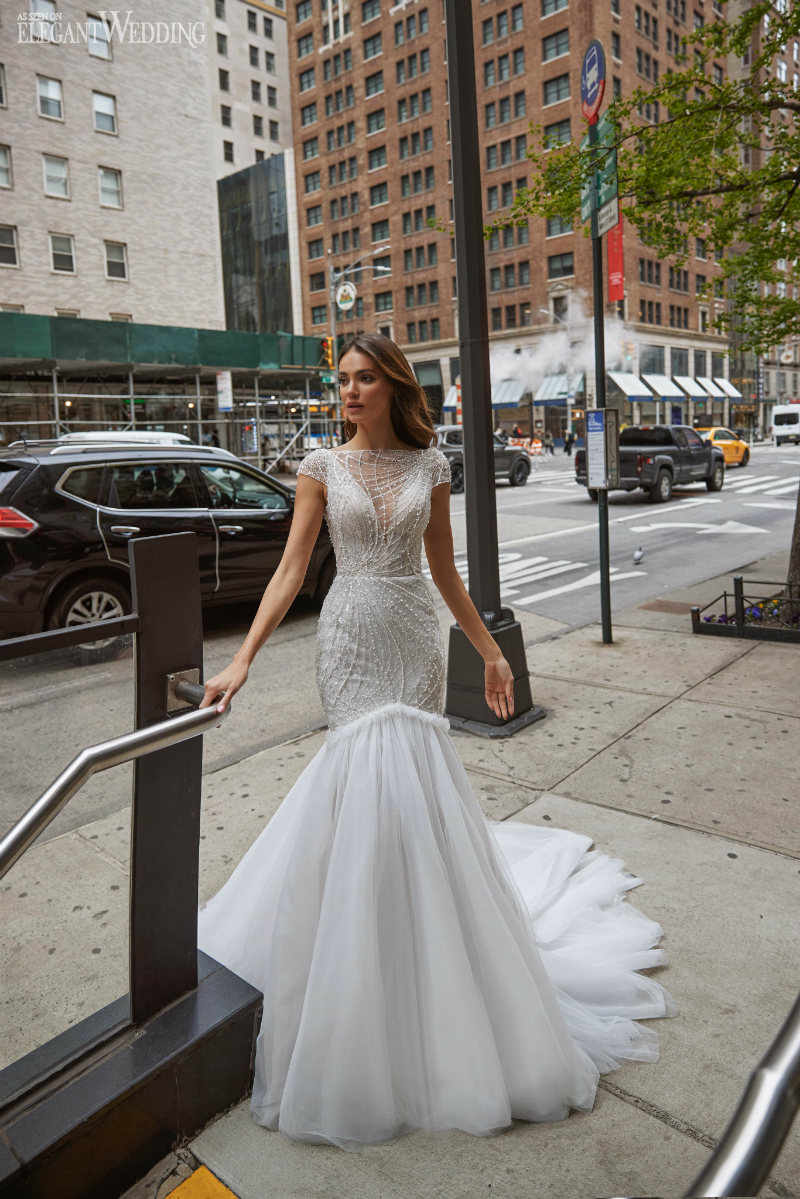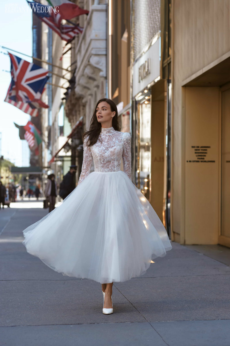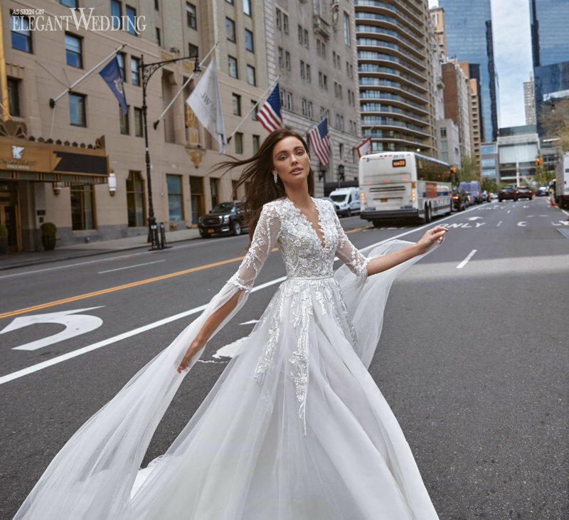The collection introduces A-silhouette gowns, mermaid styles, lush ball gowns, and midi-length dresses. The unique feature of the collection is hidden in detachable capes and boleros that enrich a single dress with double sensation. The wedding gowns are made with lightweight fabrics, a large variety of embellishments, a combination of colors, and experiments with length.