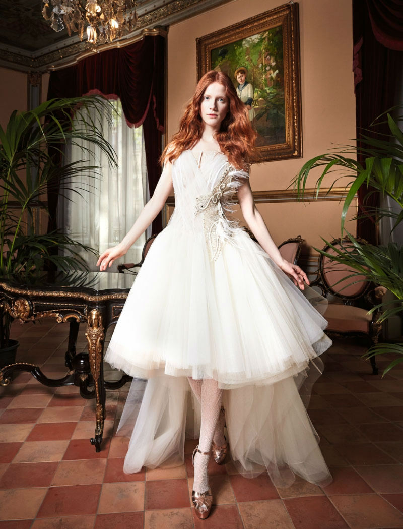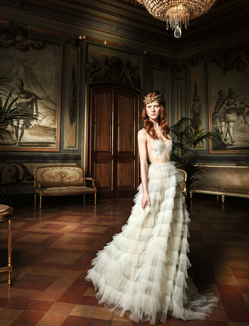 Modern silhouettes, a grandiose backdrop and the use of Victorian-Esque hoop skirts classify Yolan Cris 2017 “Couture Bride” collection as an ode to celebrating both old and new. Ruffled skirts, delicate tulle and luxurious lace embrace the newfound philosophy that nude is the new white, while two-piece cut-outs, couture overskirts and caged corsets allow for unique shapes to steal our attention.